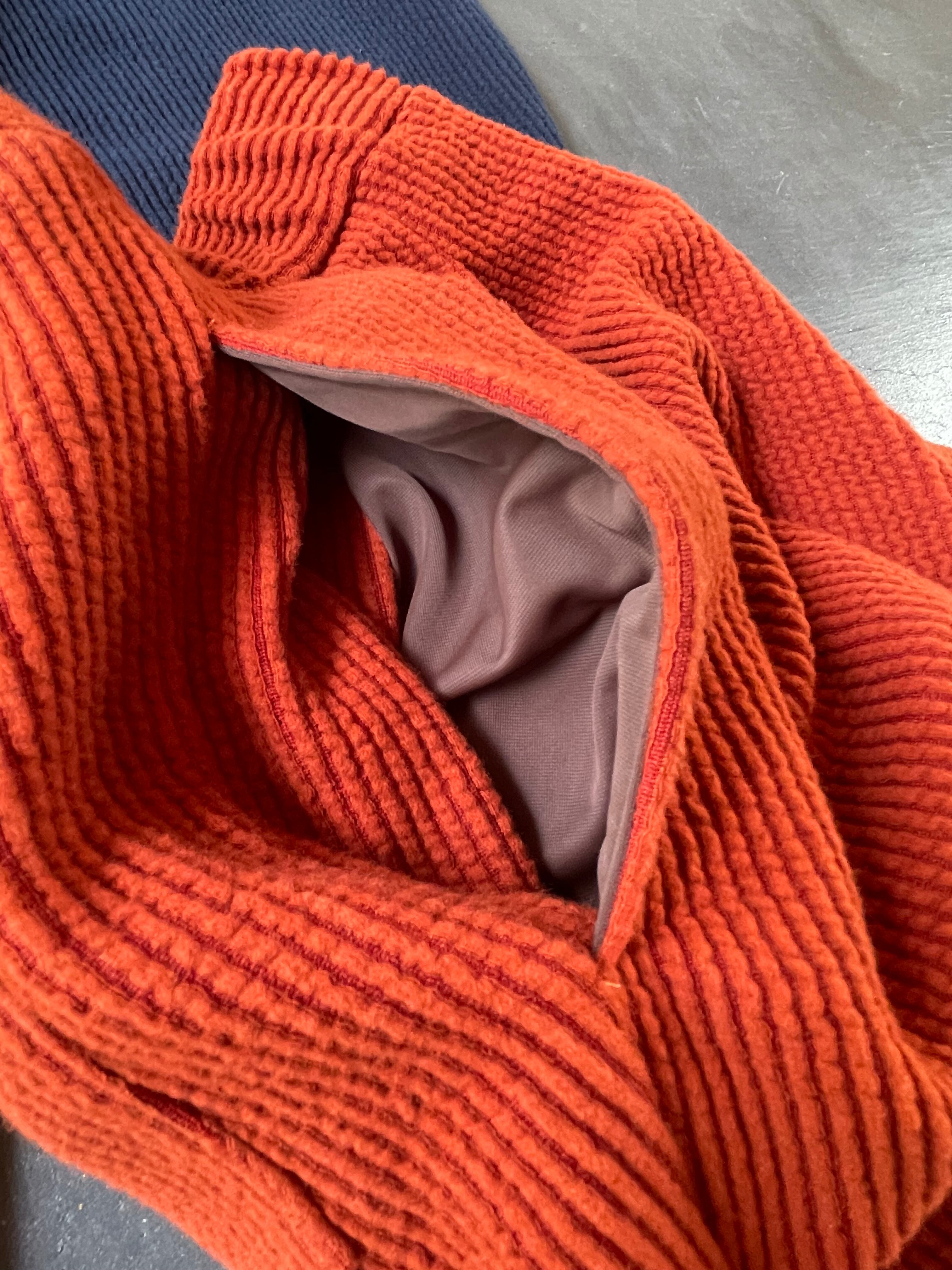 布帛のコーデュロイ組織のルックスと厚みはそのままに、しなやかなストレッチ性を持つイージーケア素材を目指し、コットンメポリエステルの接結編みで表現したファブリックライクコーデュロイジャージー素材。表側のコットンに繊細な起毛加工を施し、膨らみと温かみを持たせたりラックスジャージー素材。