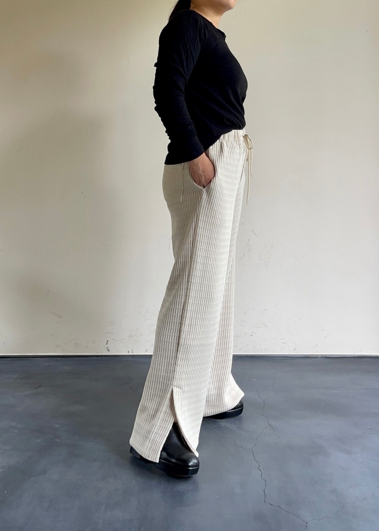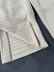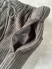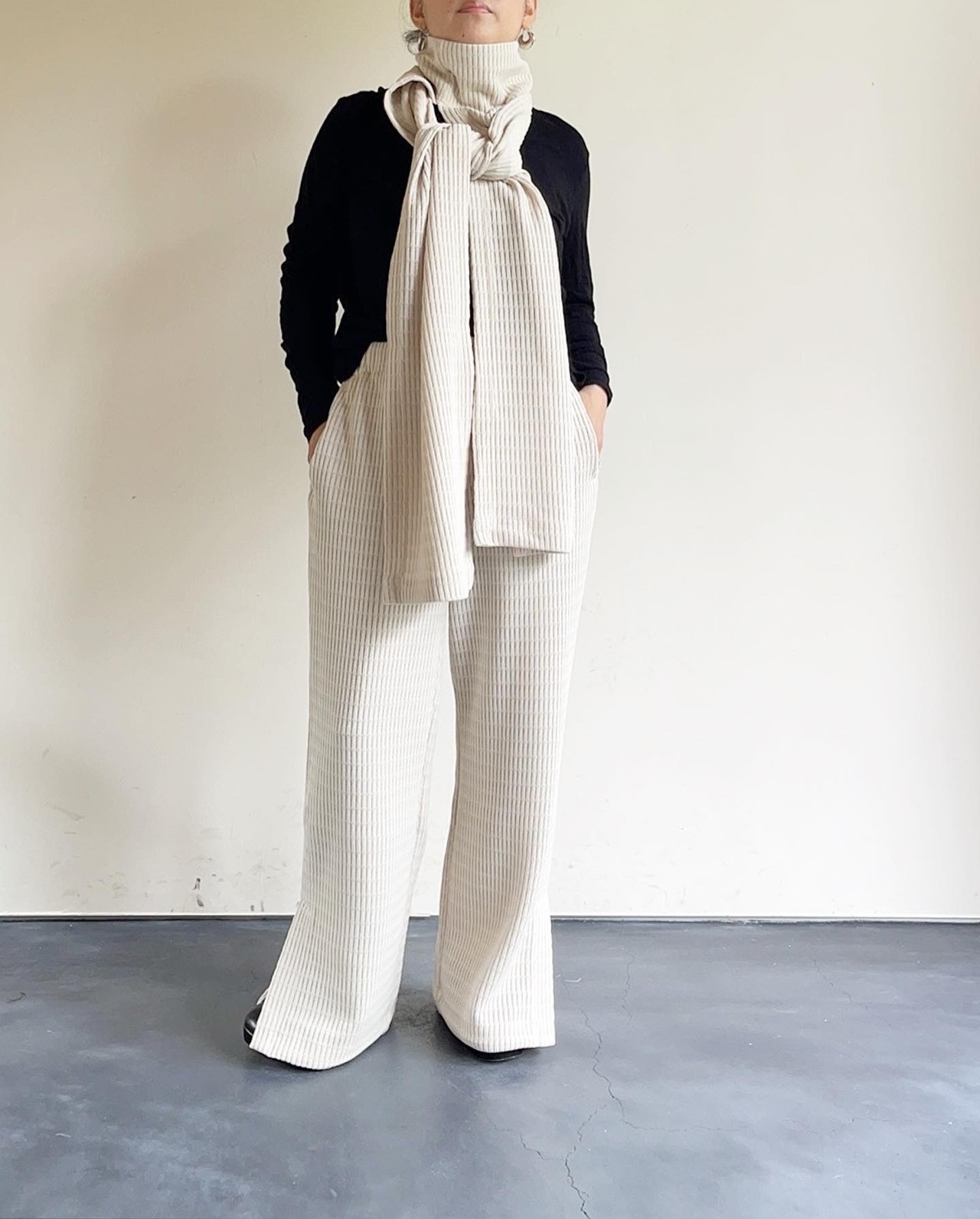 表面ローゲージリブ(8G)と裏面ハイゲージ天生(32G)を接結技法で組み合わせ、ボンディング素材のような質感を型崩れしにくい安定した物性で1枚の生地に表現したジャージー素材。
