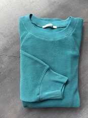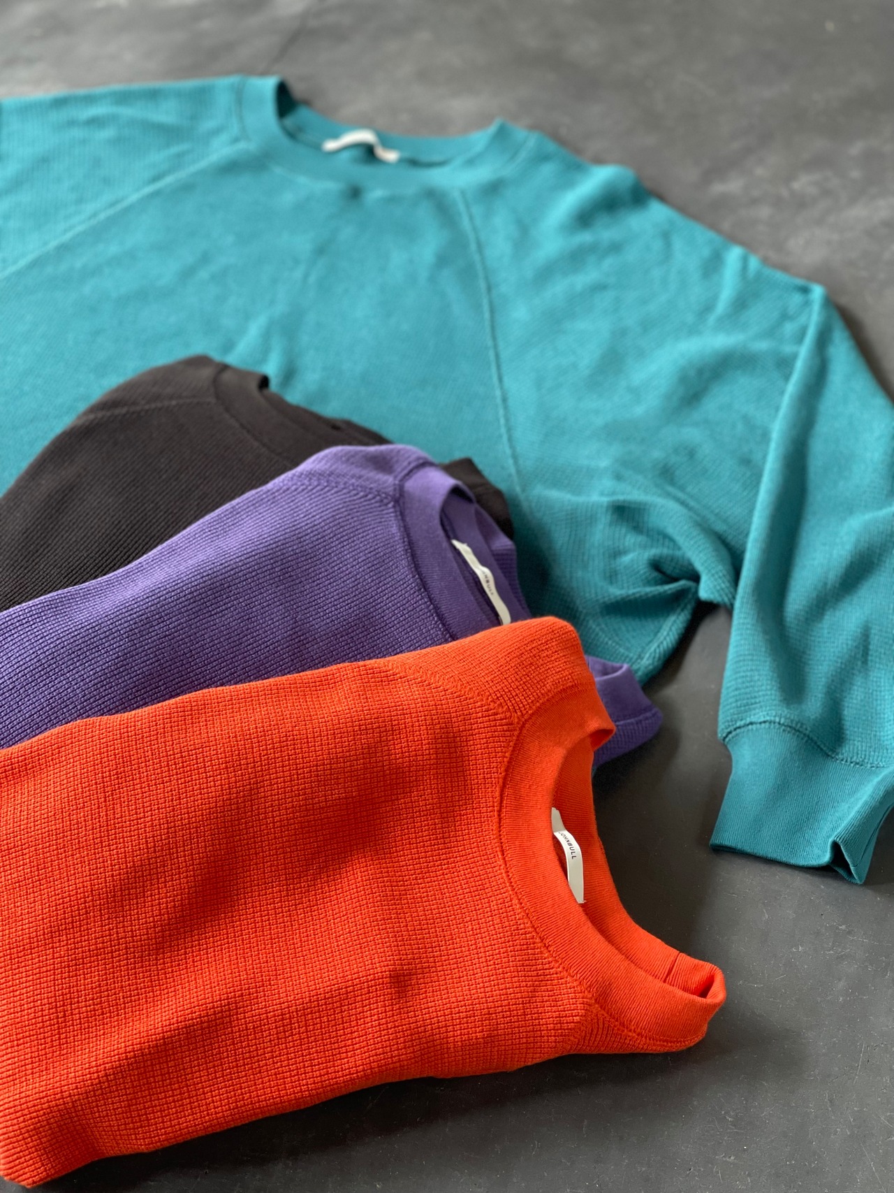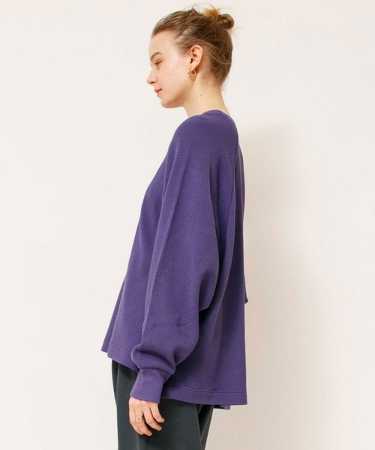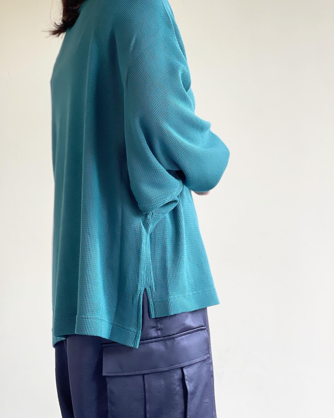 変形編みのワッフルを編み立てた生地を使用したプルオーバー。