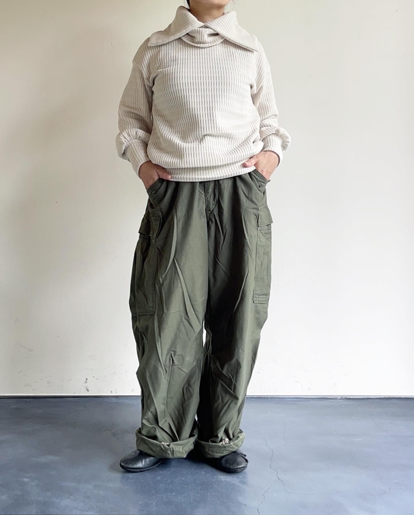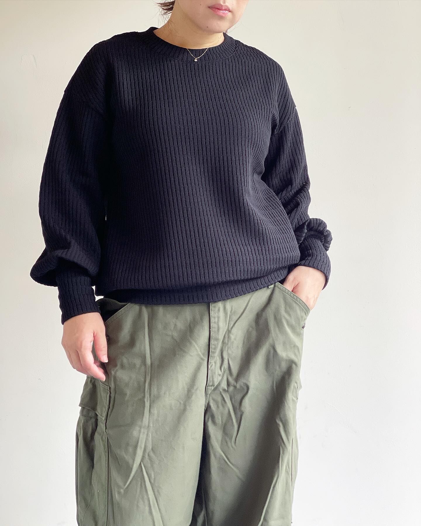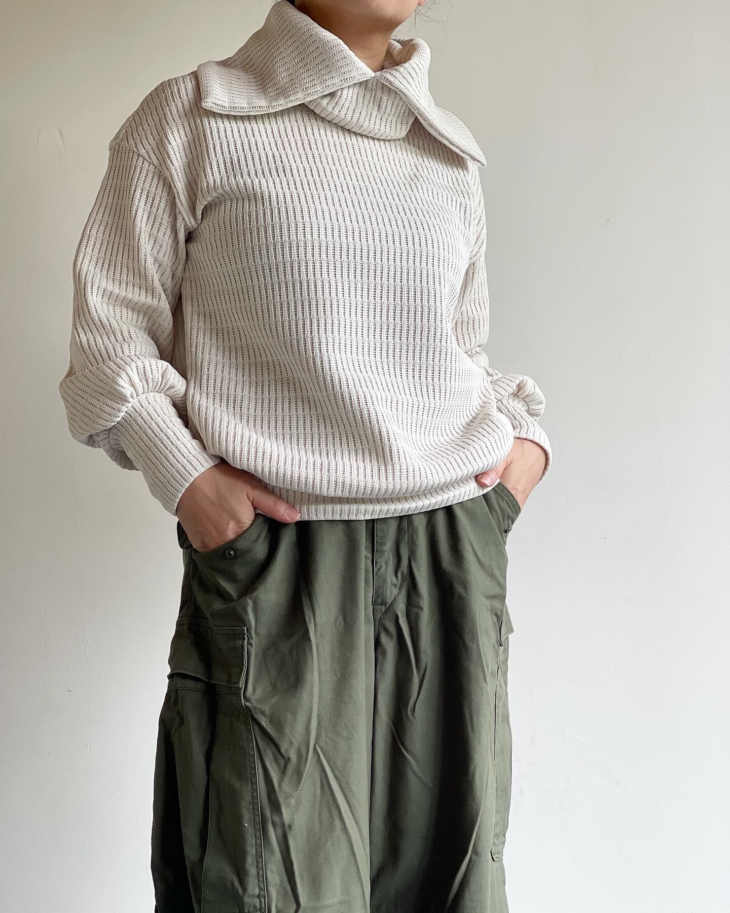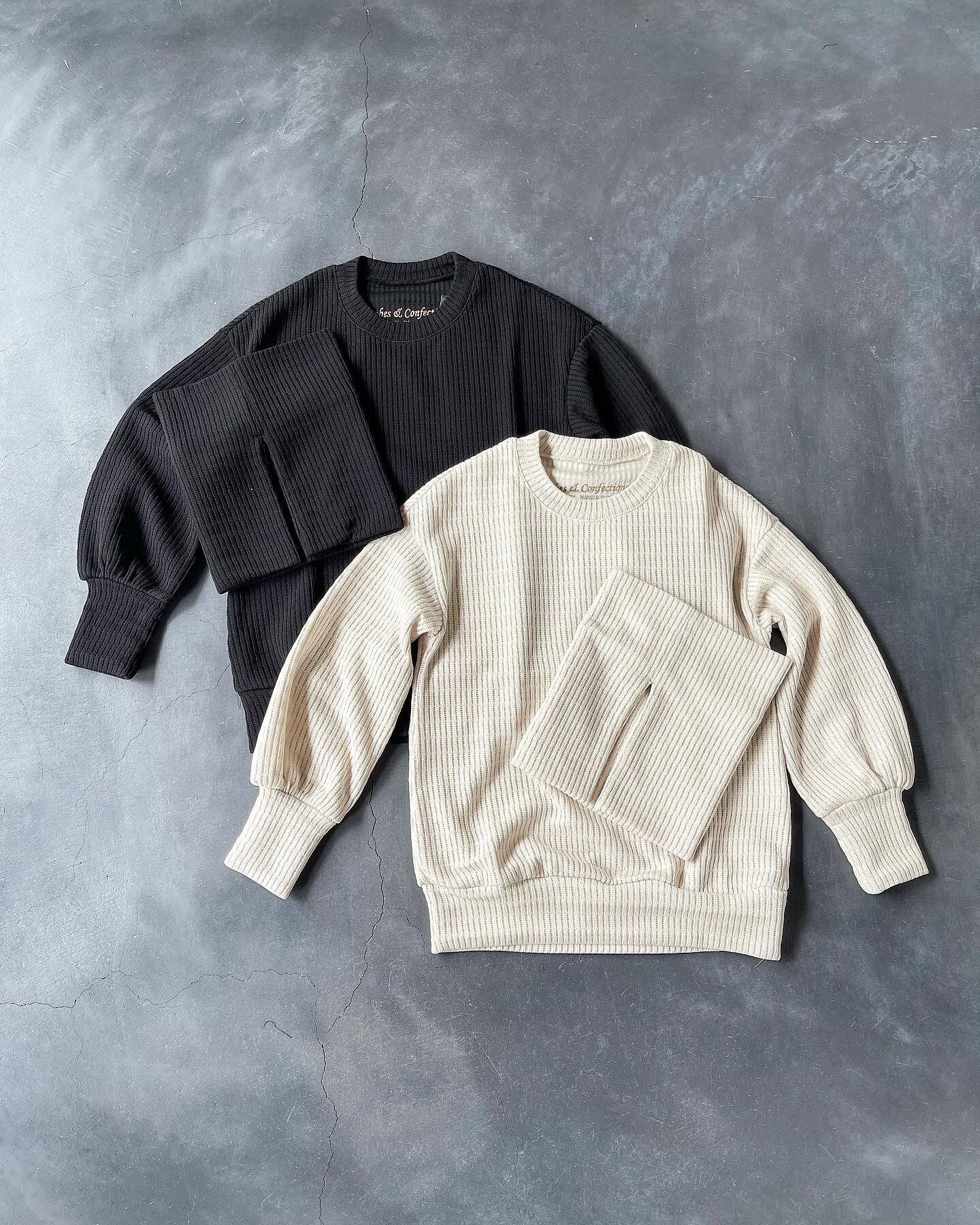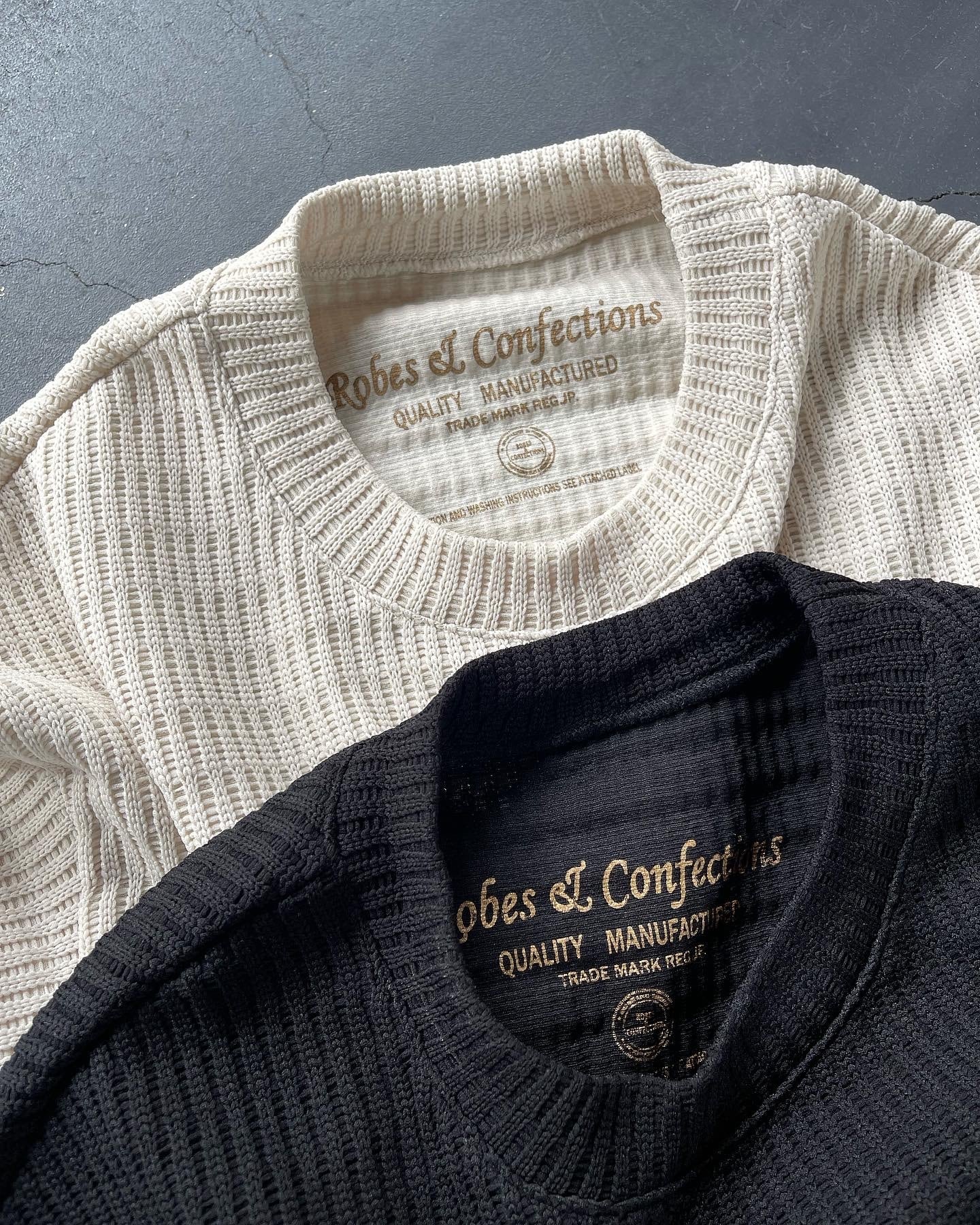 表面ローゲージリブ(8G)と裏面ハイゲージ天生(32G)を接結技法で組み合わせ、ボンディング素材のような質感を型崩れしにくい安定した物性で1枚の生地に表現したジャージー素材。
