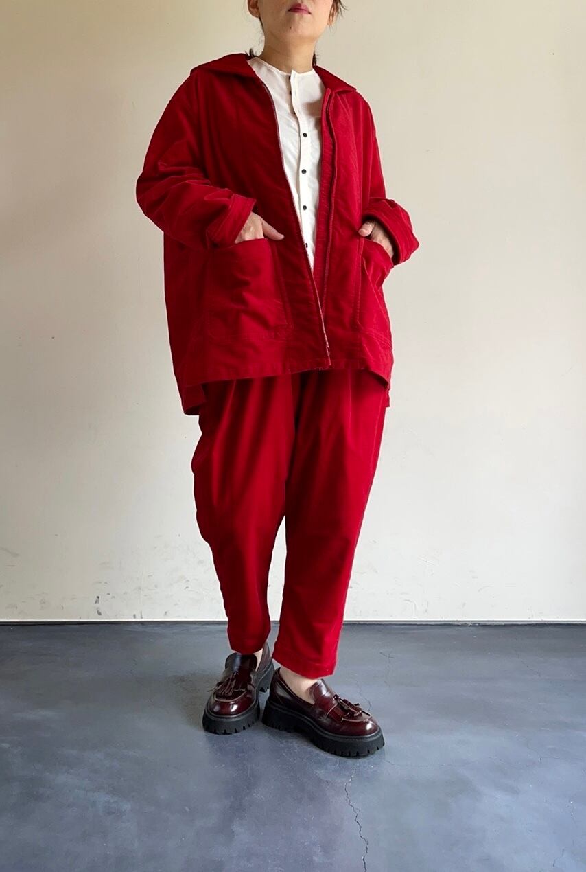 表面はコットンのパイルカットによるマットな光沢感があり、裏面には膨らみのあるポリエステル糸を使用することで裏無しでもさらりとした着心地の素材です。製品洗いによって起毛感にムラを生み、ヴィンテージ感のある風合いと勝らみを持たせています。