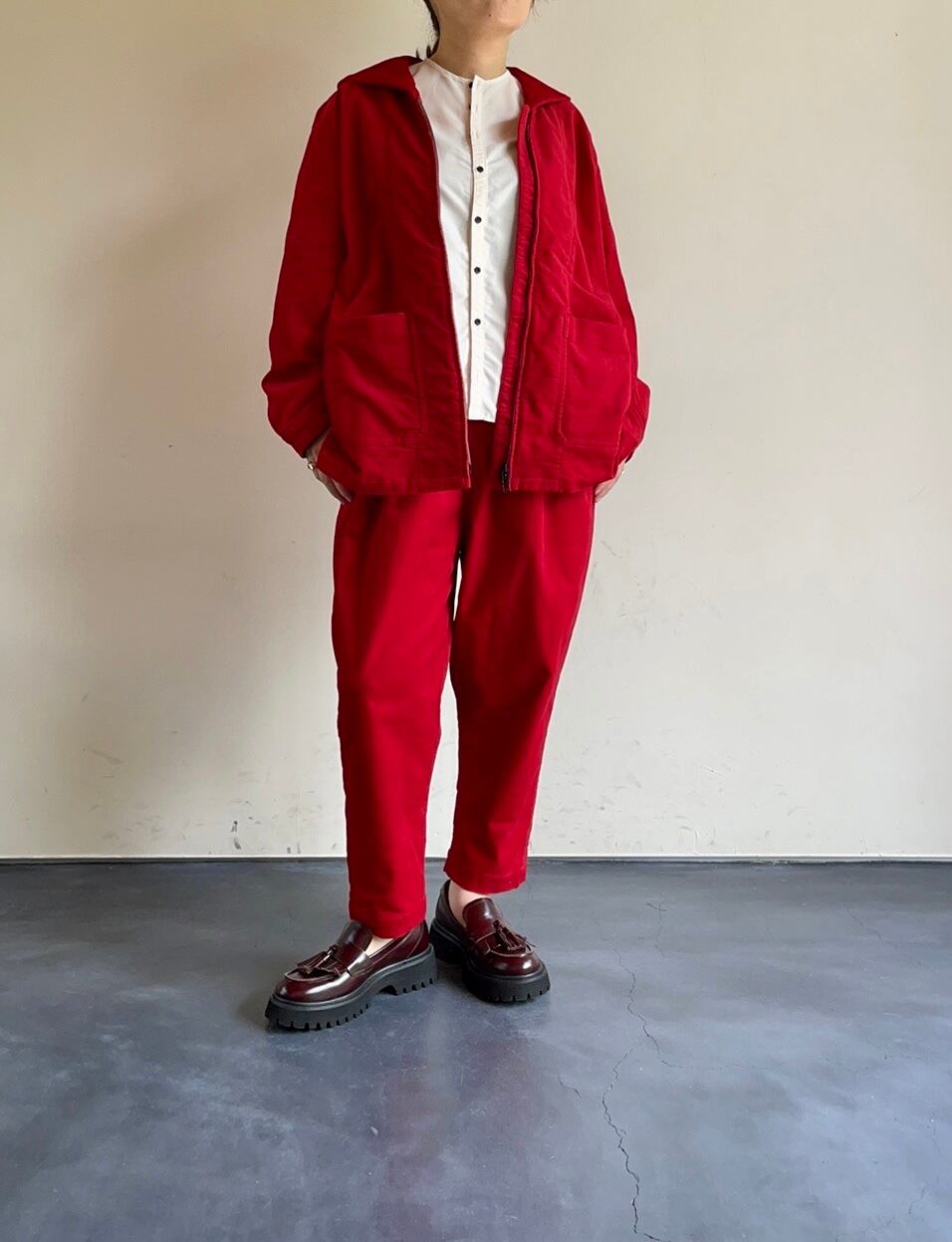表面はコットンのパイルカットによるマットな光沢感があり、裏面には膨らみのあるポリエステル糸を使用することで裏無しでもさらりとした着心地の素材です。製品洗いによって起毛感にムラを生み、ヴィンテージ感のある風合いと勝らみを持たせています。