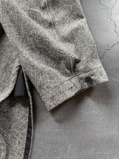 1/10のCORDURA®ナイロンとウール混紡の糸を使用した平織生地です。製品洗いによりウールのやわらかな風合いを引き出しつつ、CORDURA®ナイロンの摩粍強度も兼ね備えた、ウール100%の生地よりも文夫で長く使用していただける素材です。表向きの表情はウールの質感ですが、奥にタンプラー乾燥したナイロン特有の質感がありとても風合い豊かな生地です。