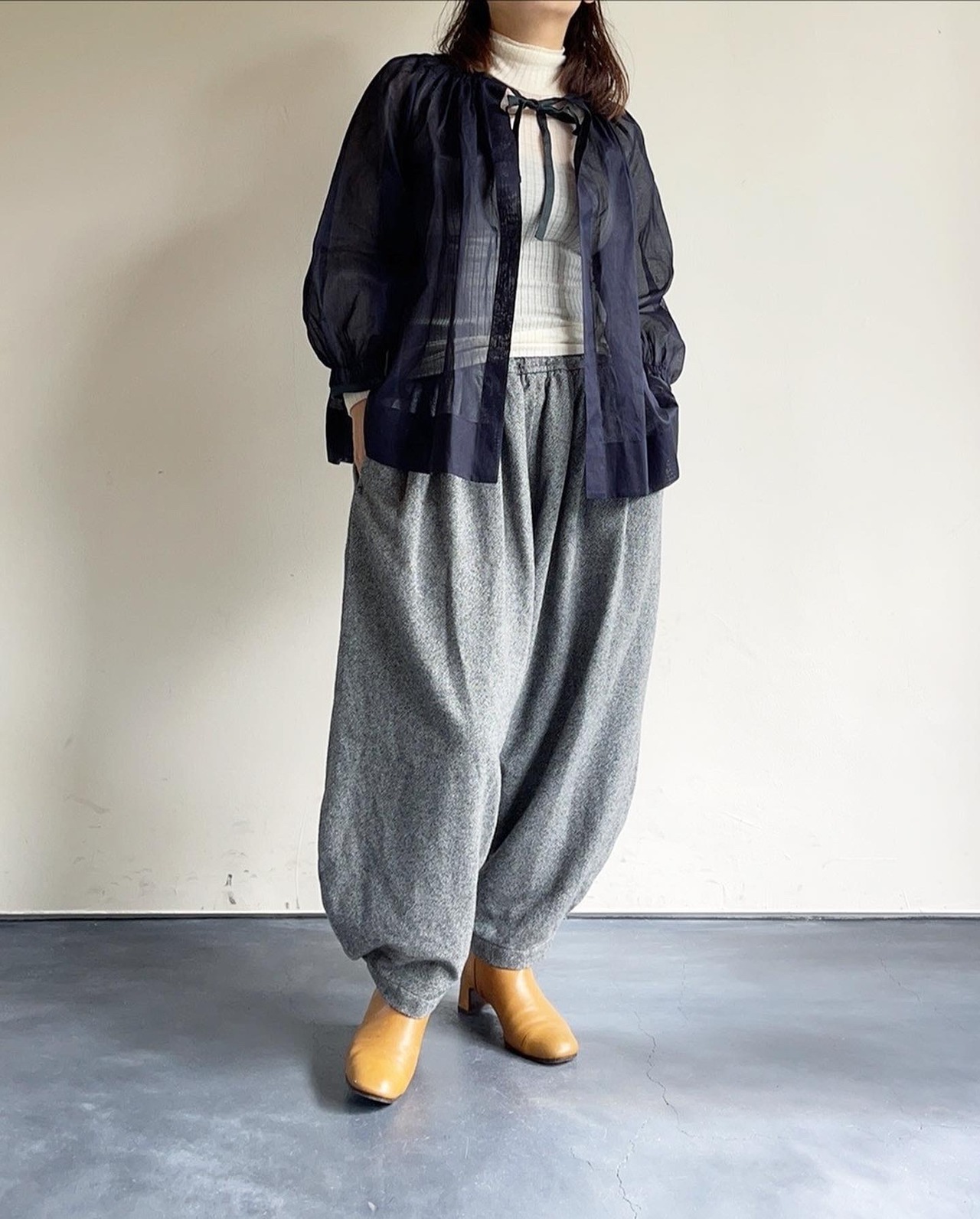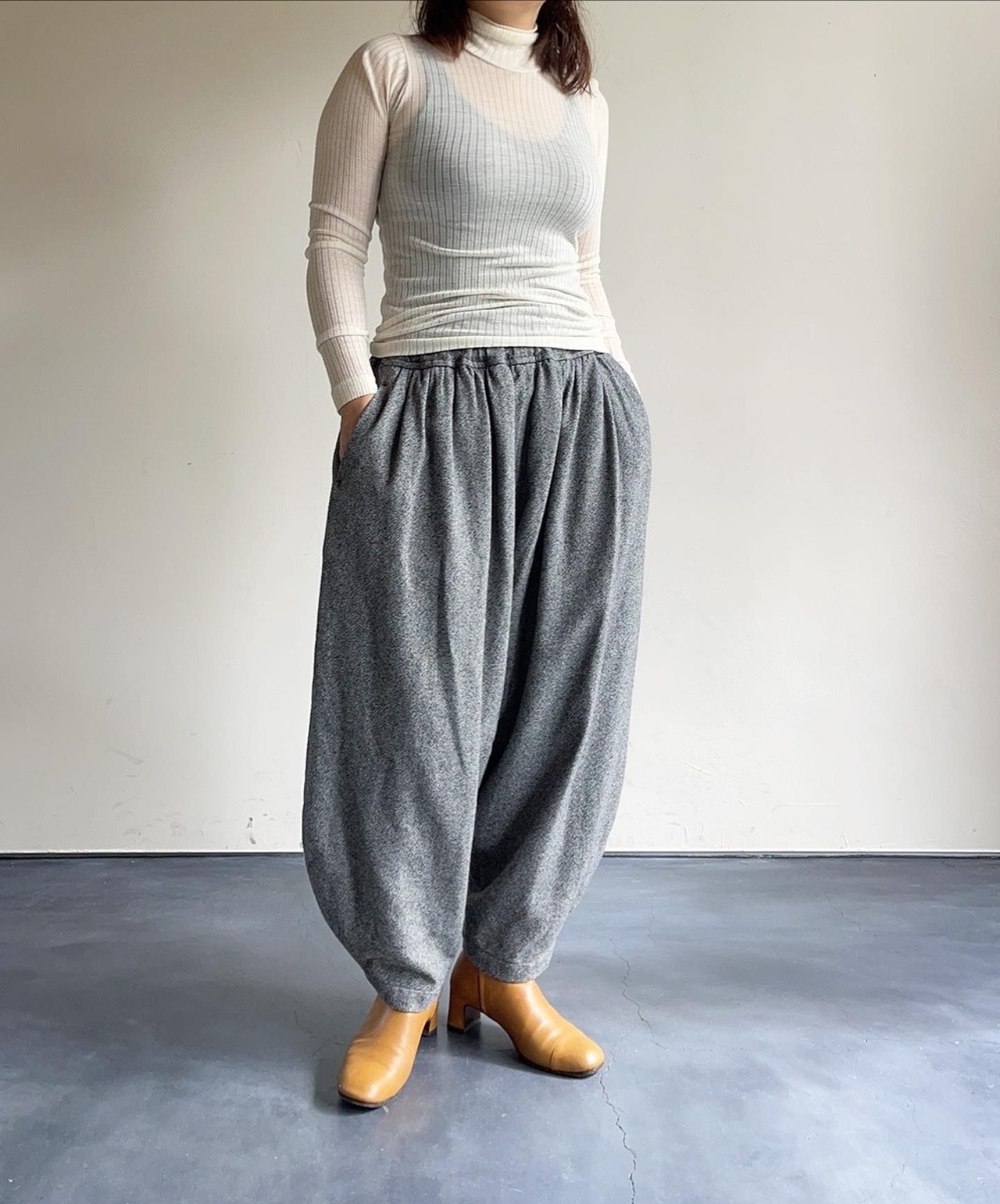 1/10のCORDURA®ナイロンとウール混紡の糸を使用した平織生地です。製品洗いによりウールのやわらかな風合いを引き出しつつ、CORDURA®ナイロンの摩耗強度も兼ね備えた、ウール100%の生地よりも丈夫で長く使用していただける素材です。表向きの表情はウールの質感ですが、奥にタンブラー乾燥したナイロン特有の質感がありとても風合い豊かな生地です。