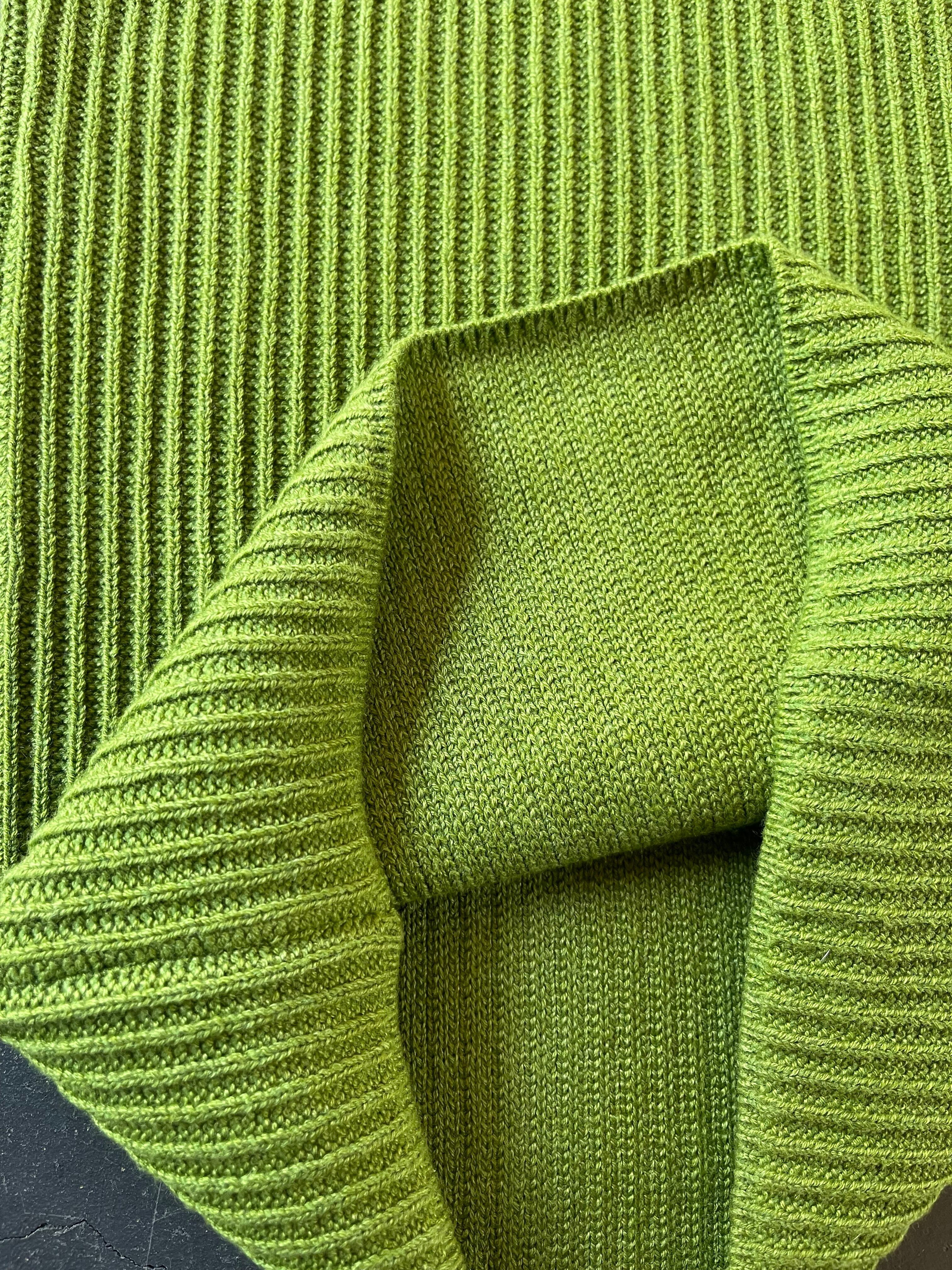 細い糸を緻密に編み込んだハイゲージのリブニット素材で、タック編みを混ぜこんだ変形リブが表情のある一枚です。