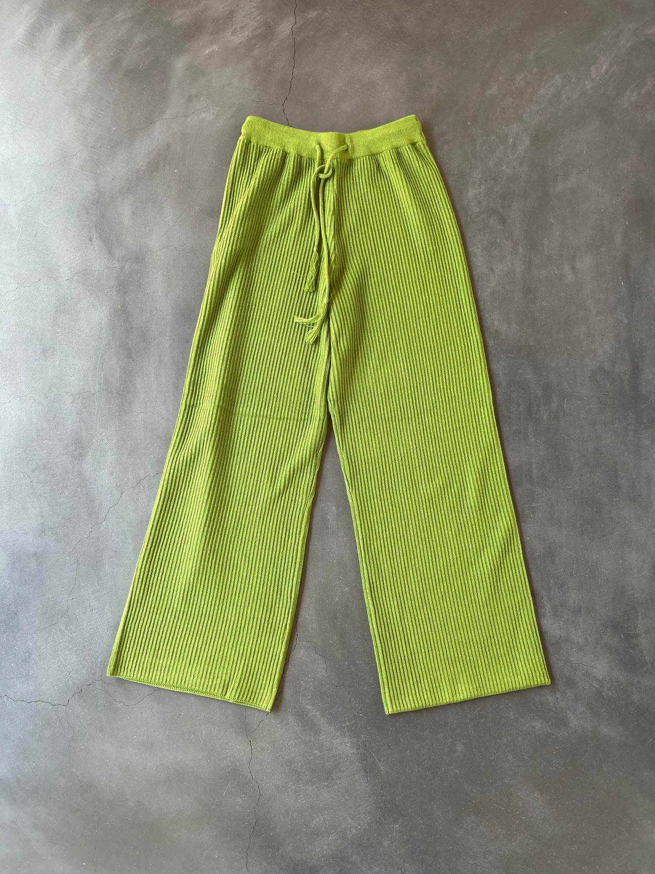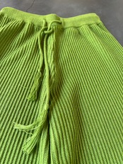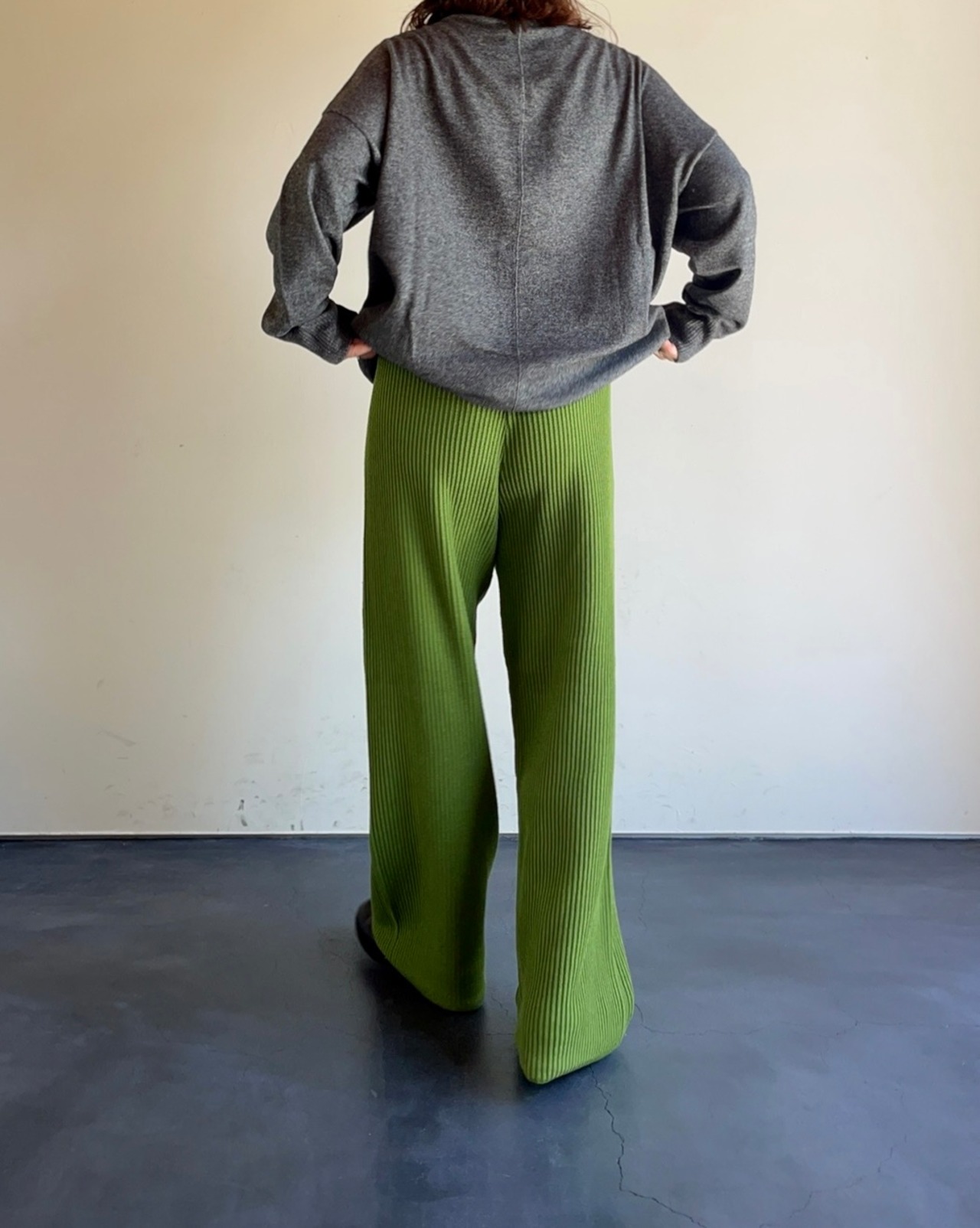発色の良いコットンアクリル糸を使用したニットパンツ。