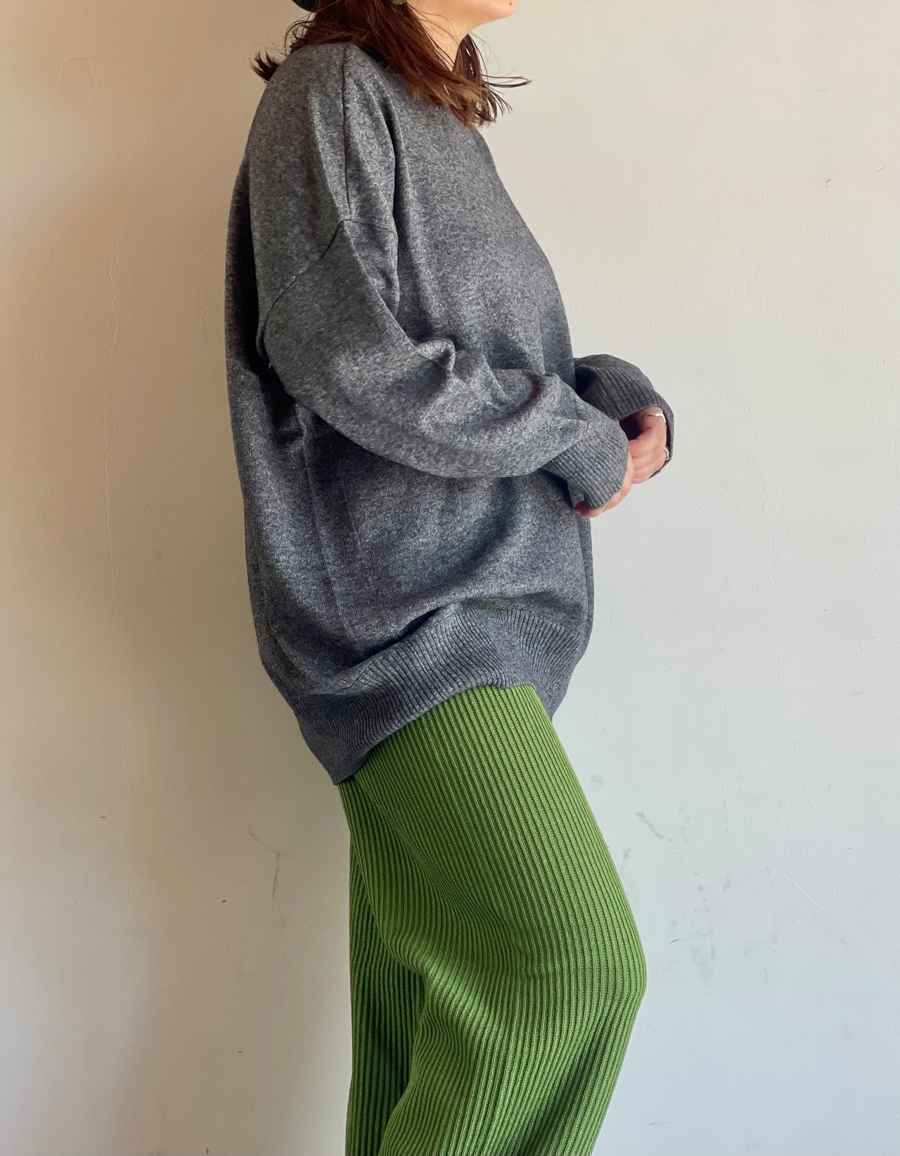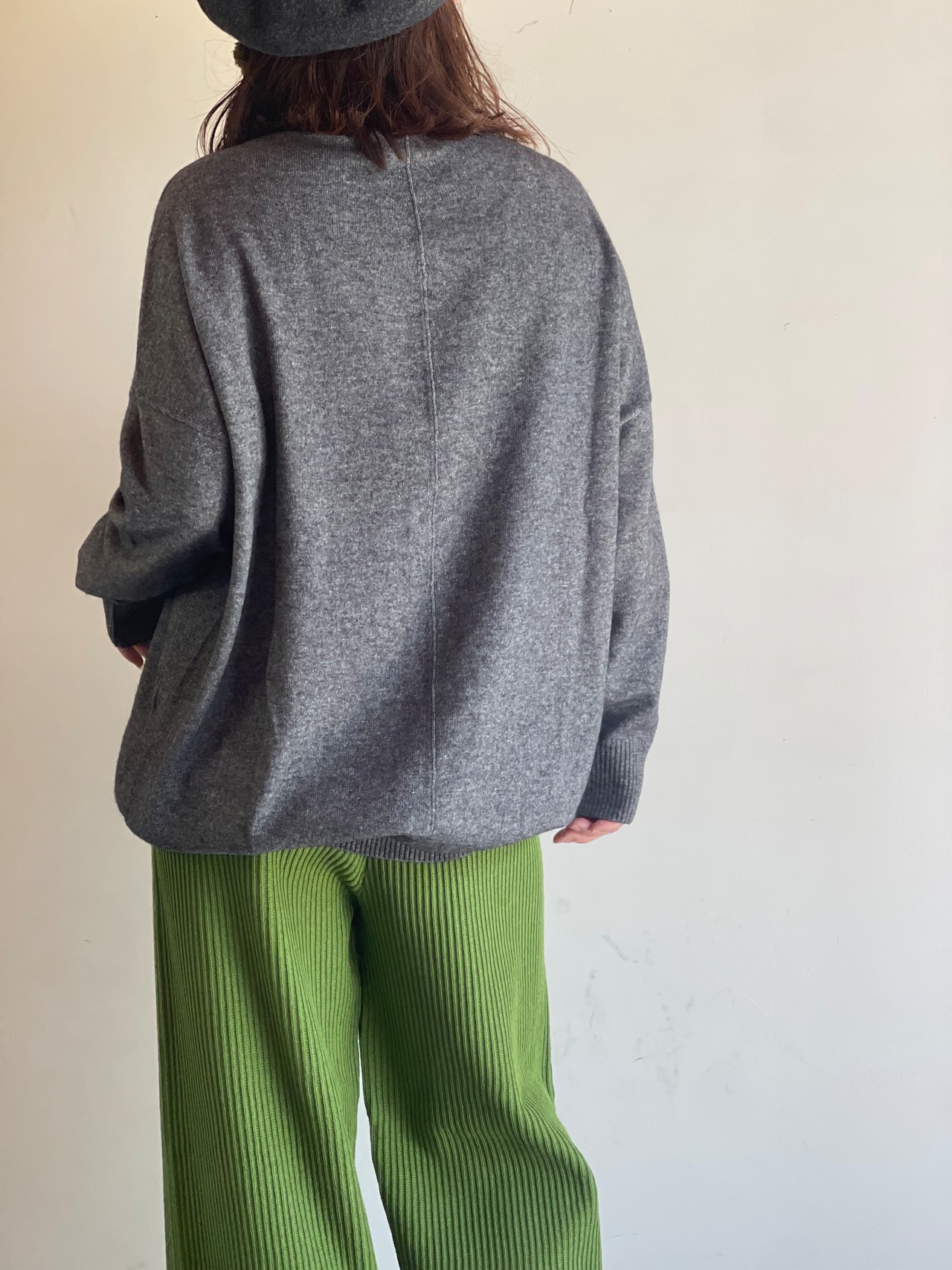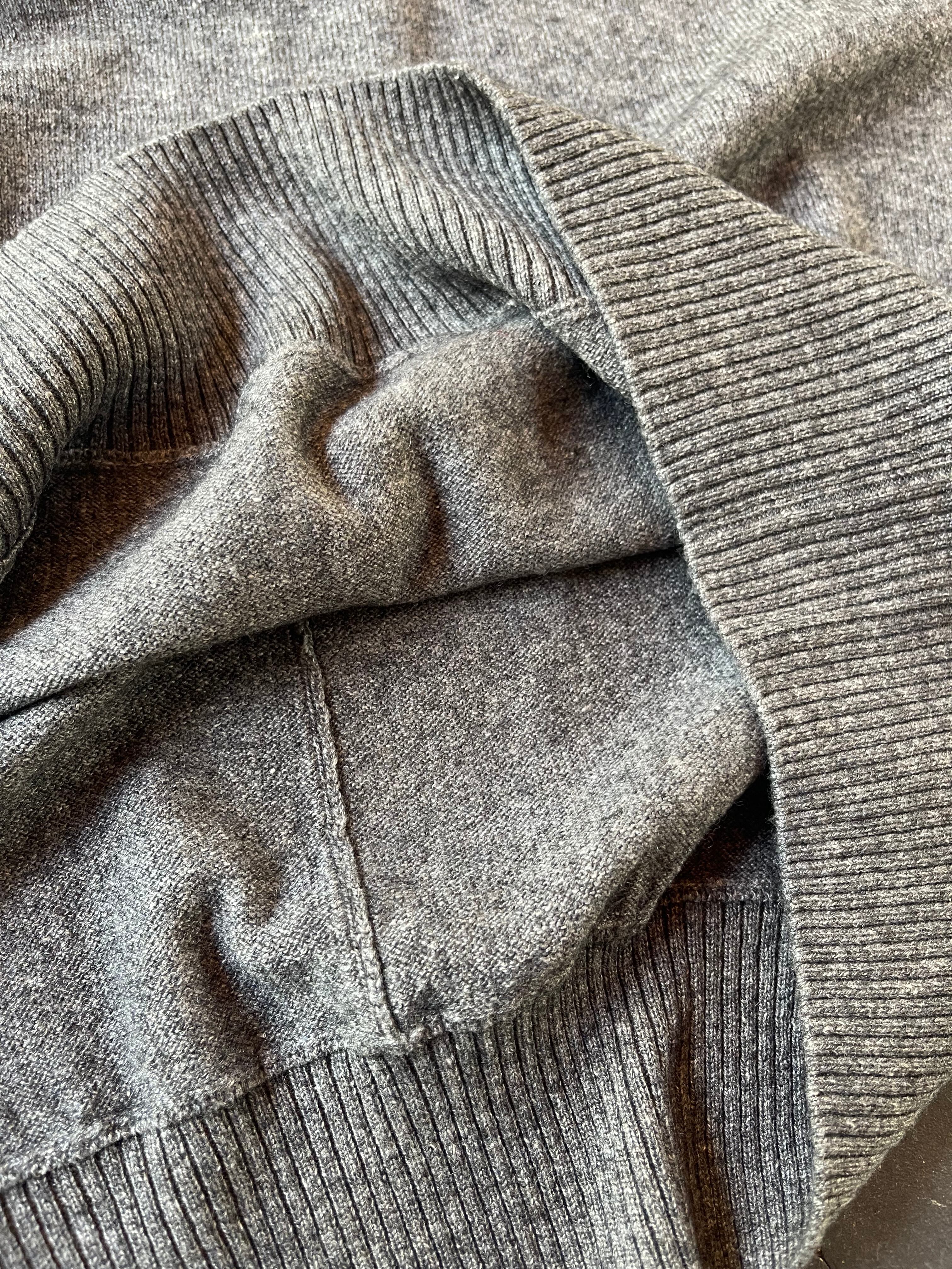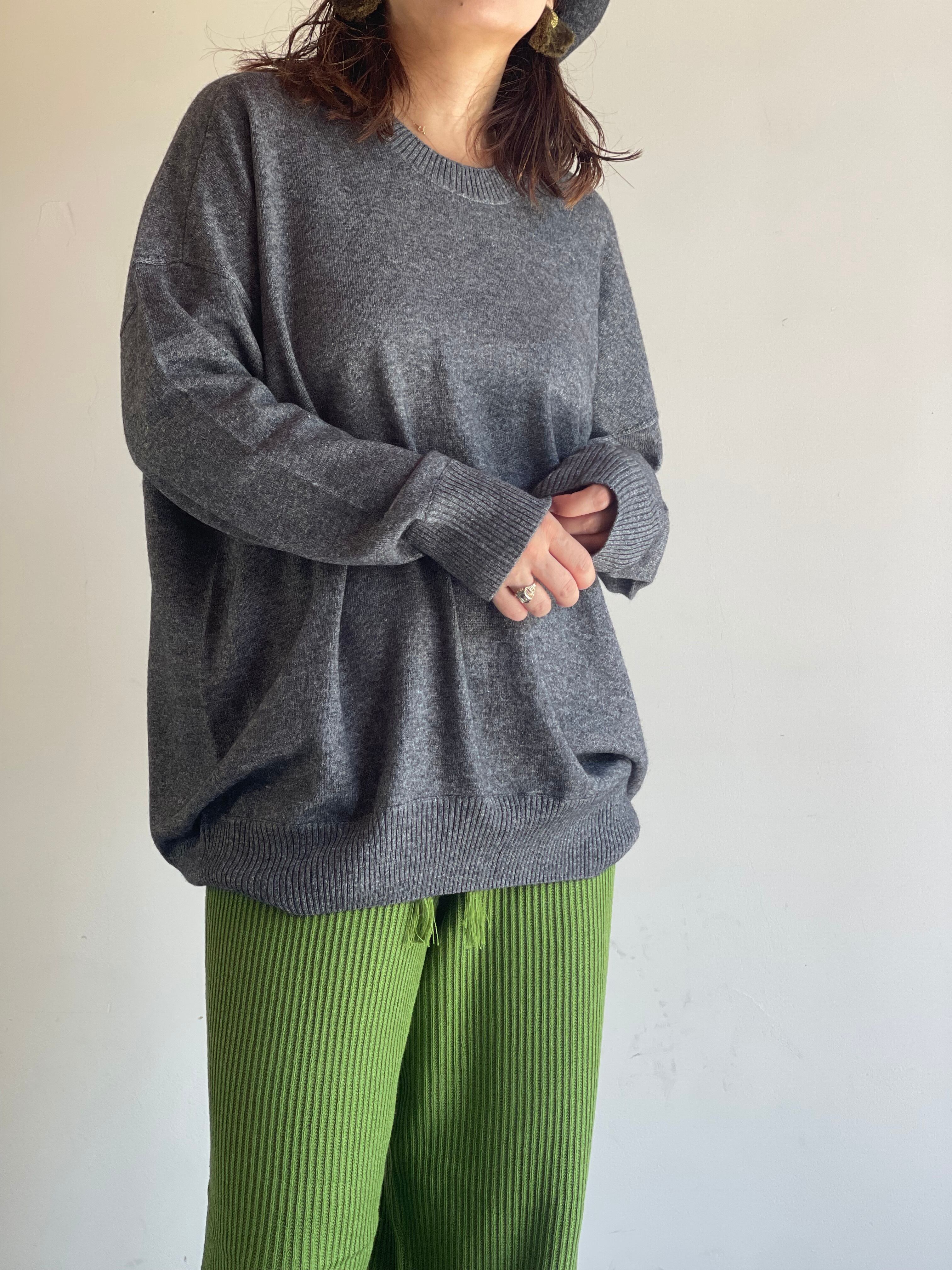 シルク55%カシミヤ45%の26/2の糸を12Gの編機で天竺編みにしたヌルみのあるタッチの横編みニットです。