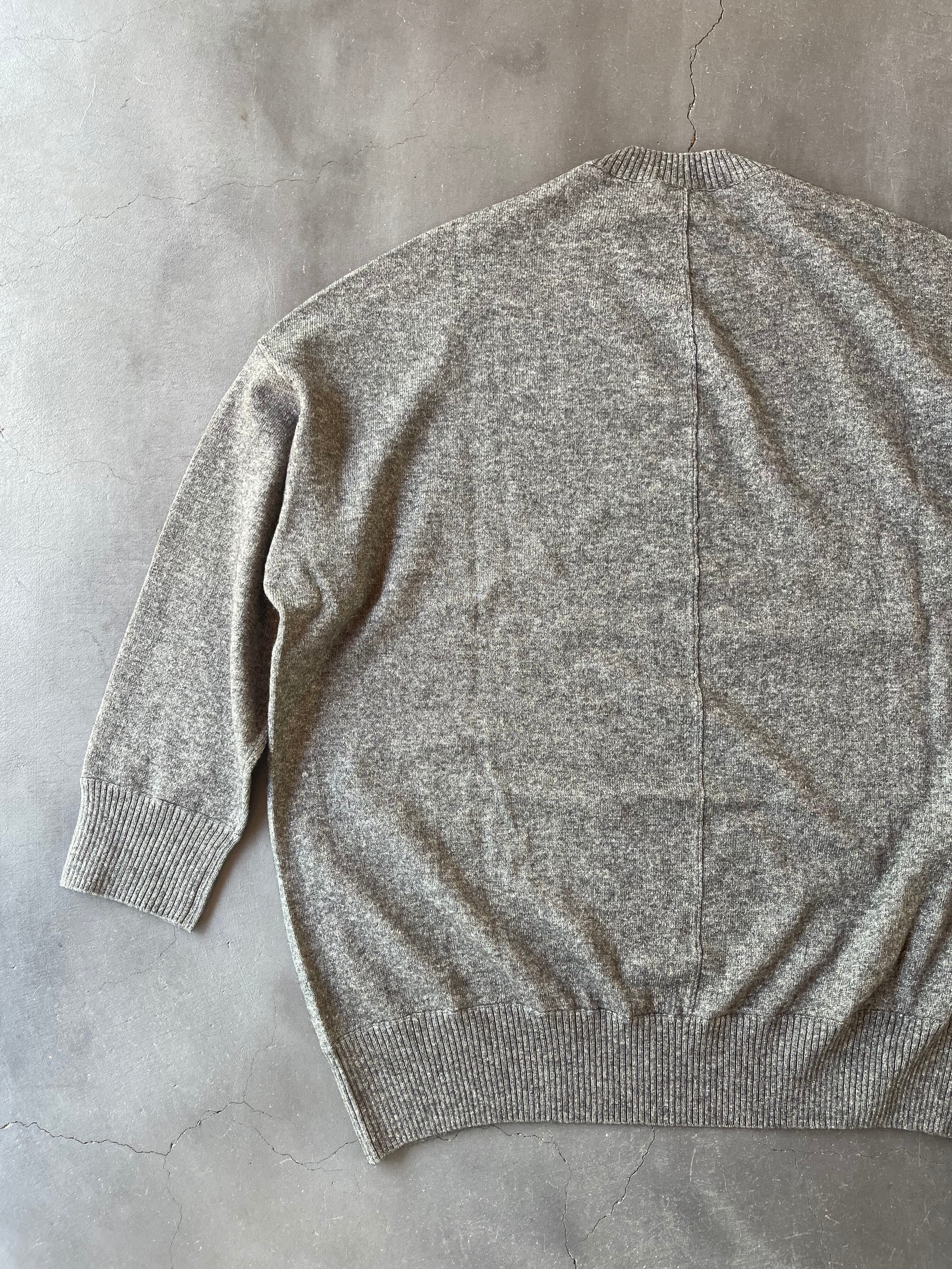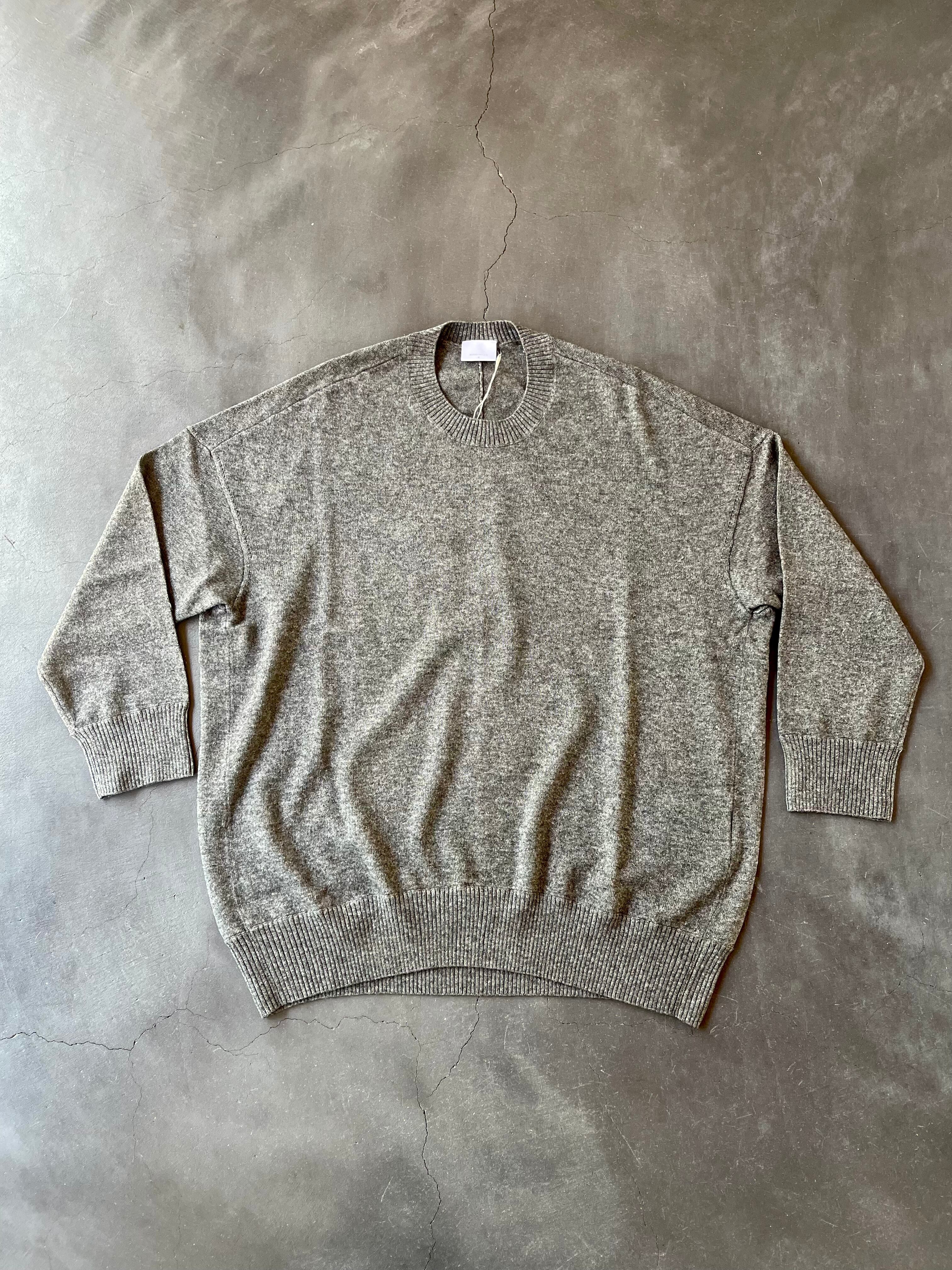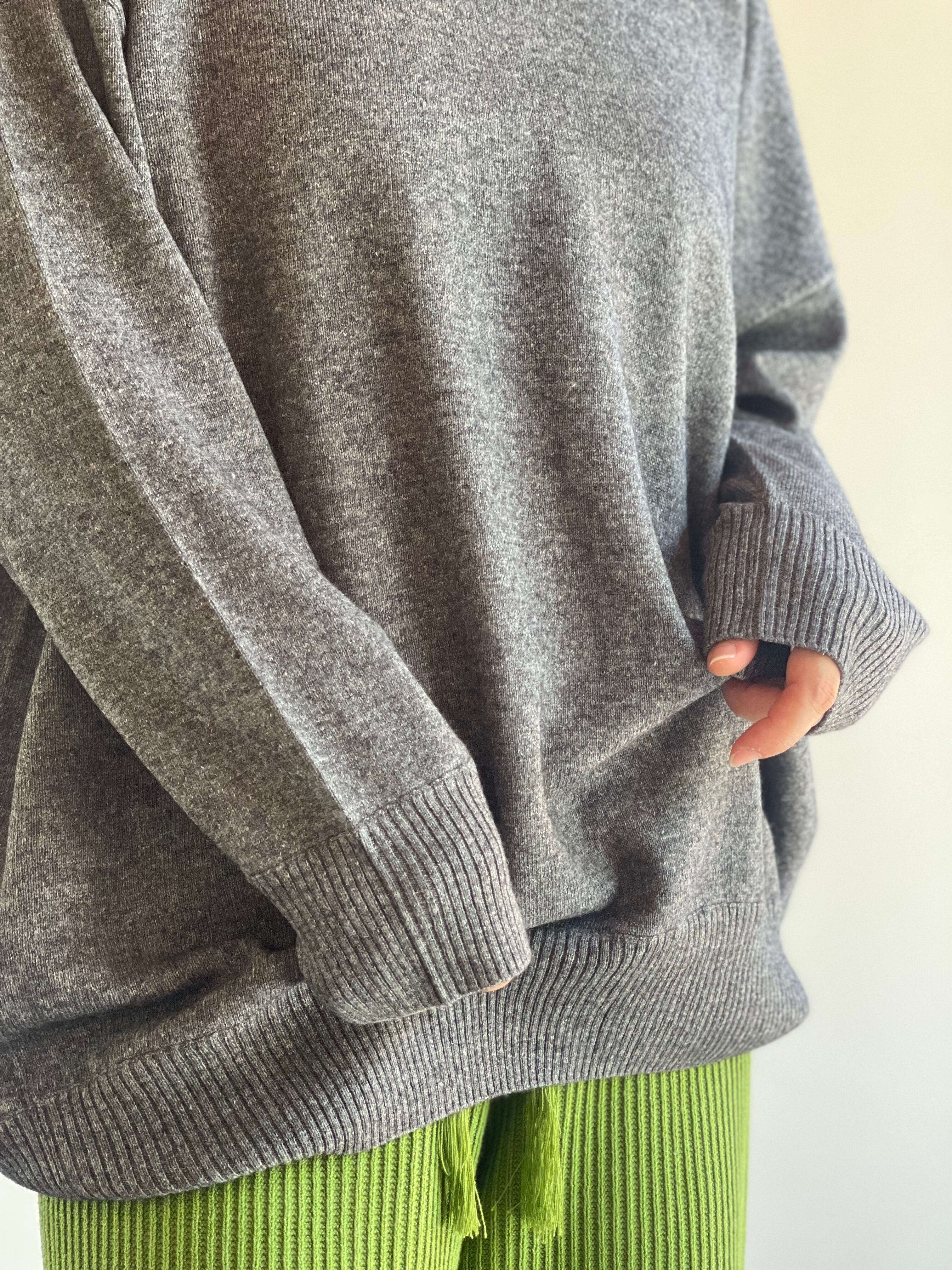 シルク55%カシミヤ45%の26/2の糸を12Gの編機で天竺編みにしたヌルみのあるタッチの横編みニットです。