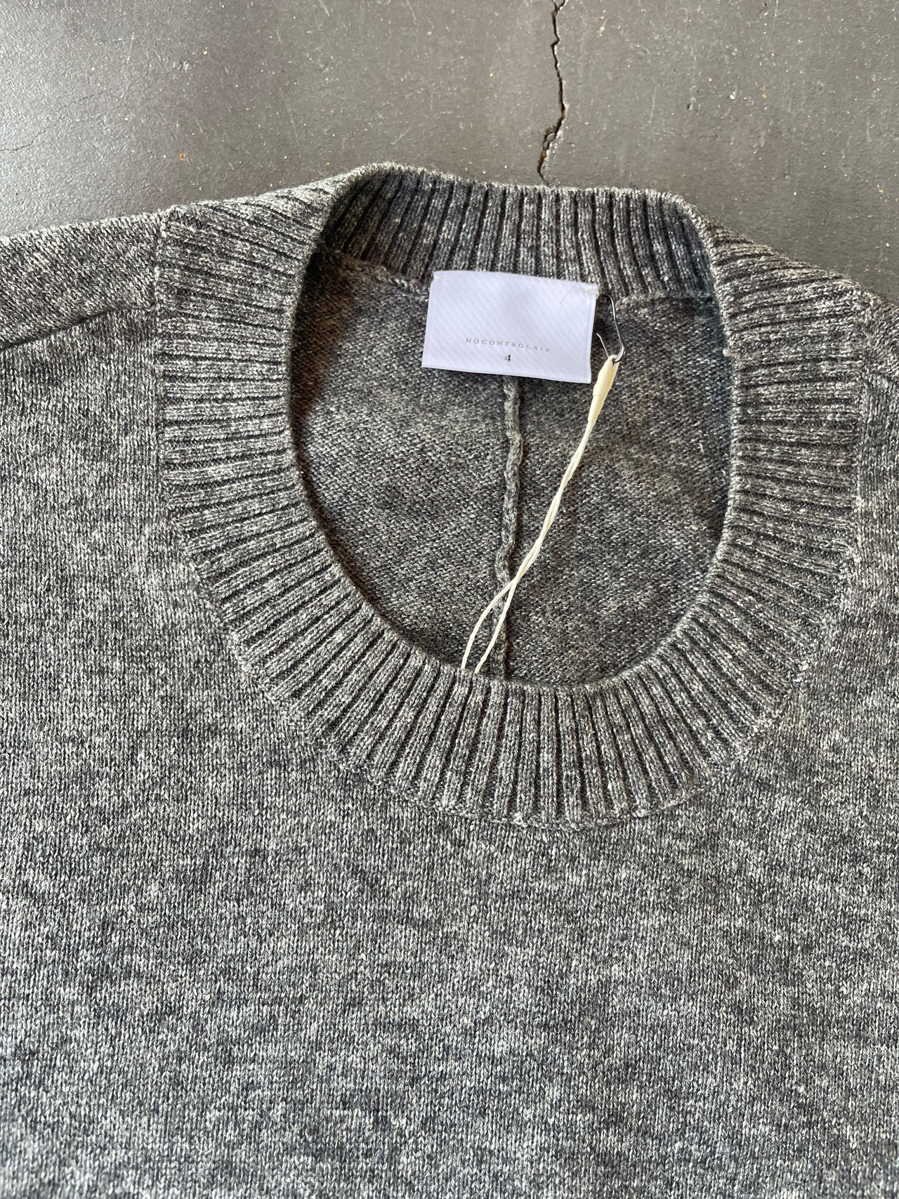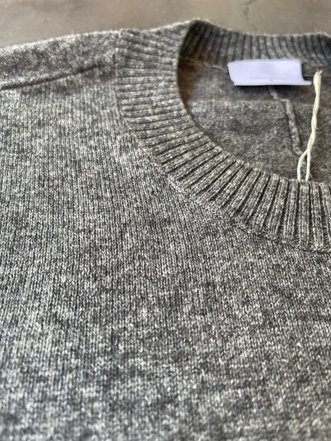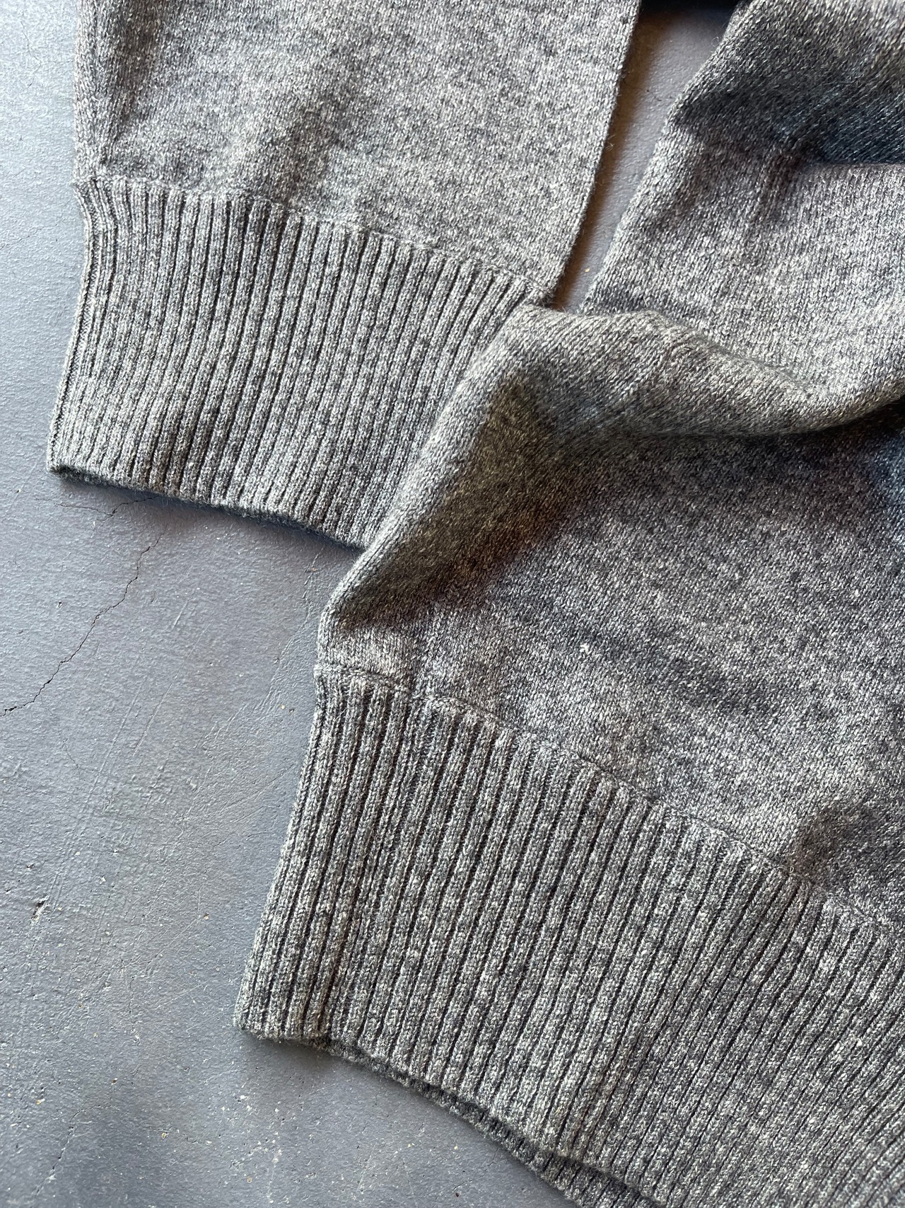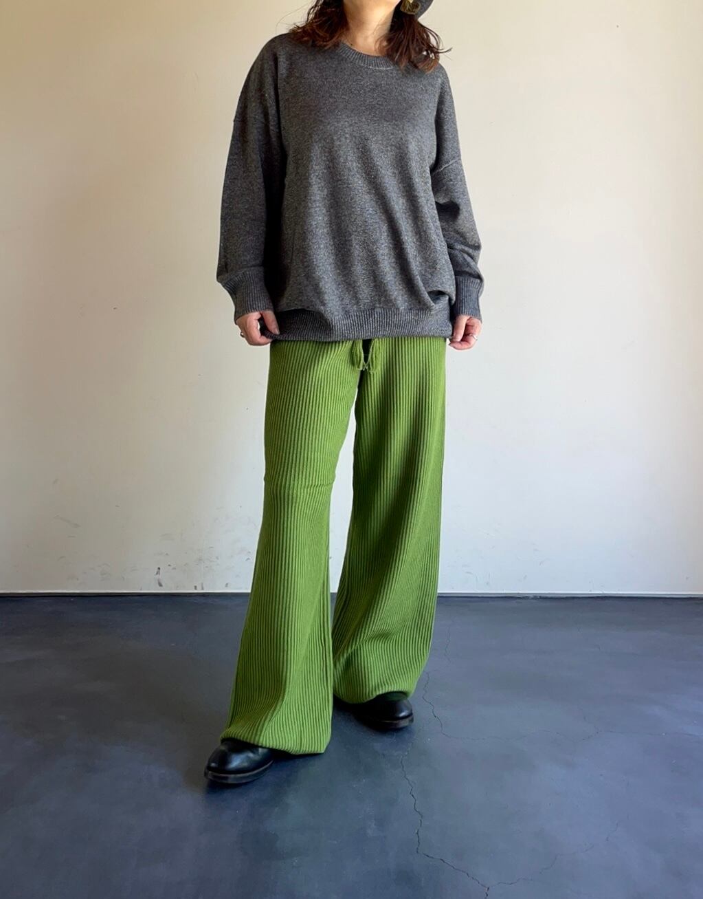 シルク55%カシミヤ45%の26/2の糸を12Gの編機で天竺編みにしたヌルみのあるタッチの横編みニットです。