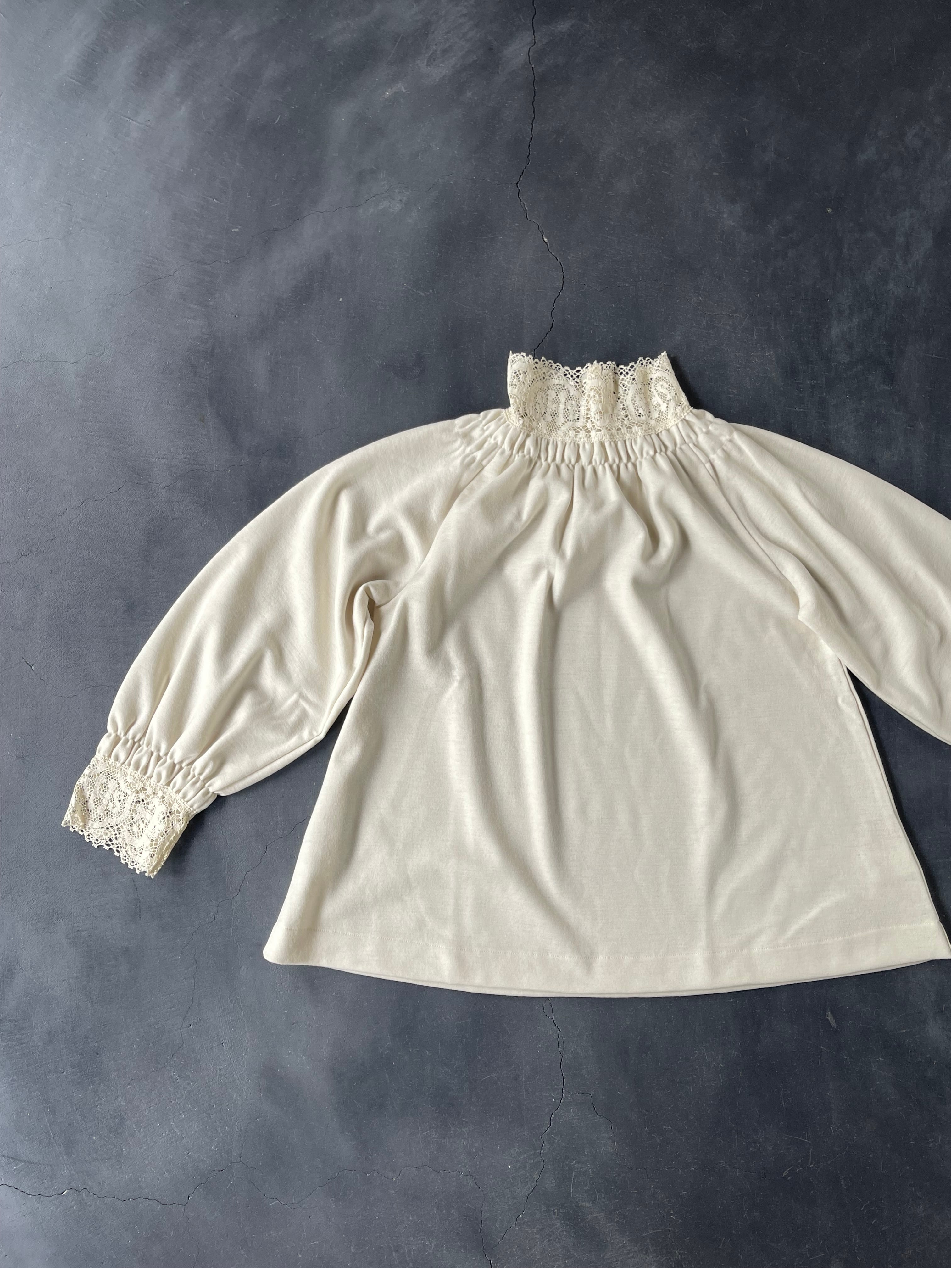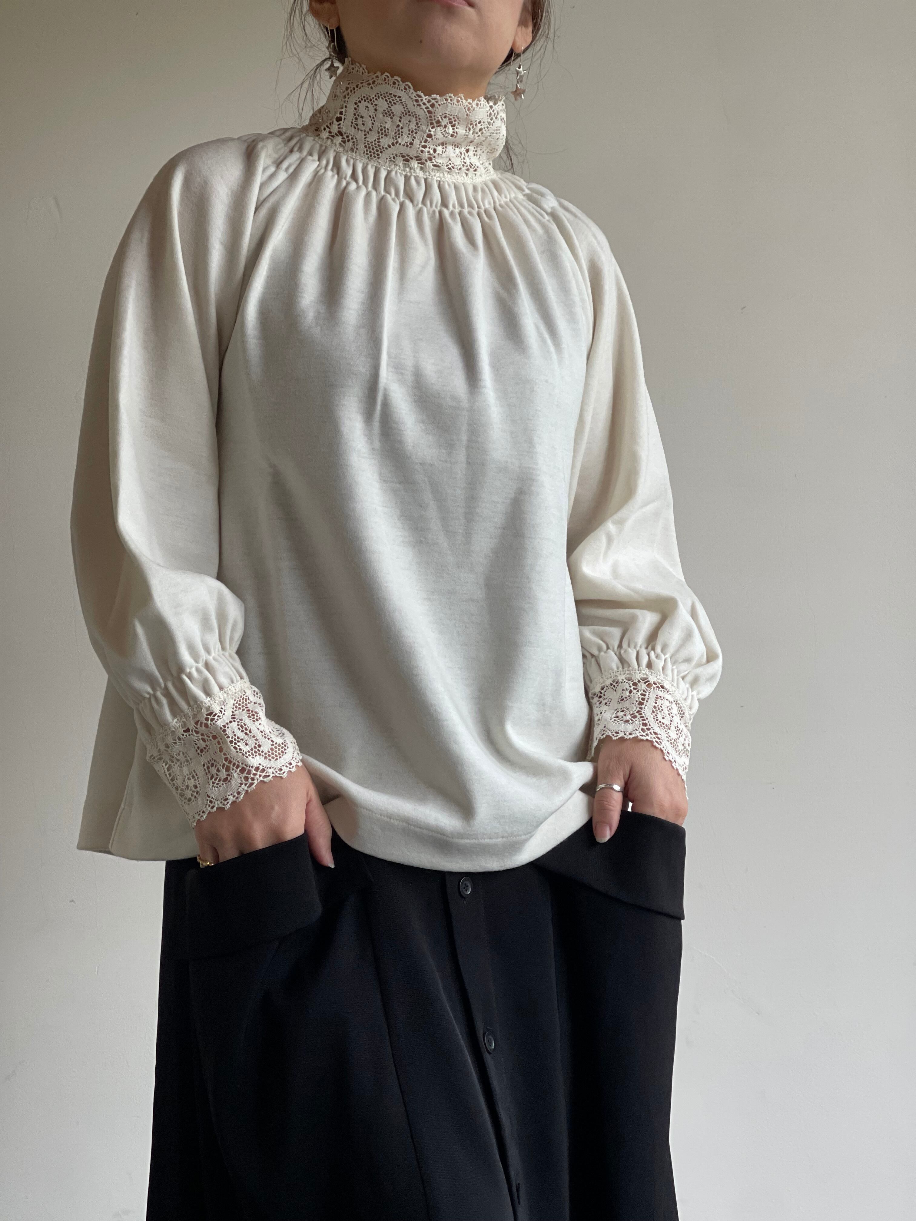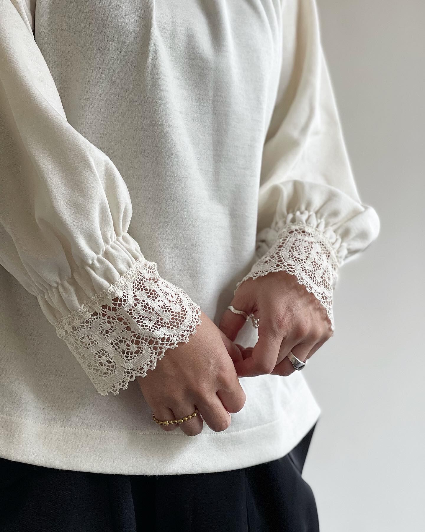 20 世紀初めに教会で着用されていた礼装用のスモックを参考にデザインされた女性らしいカットソーです。身頃にはサラッとした肌触りと伸縮性のあるウール天体を使用し、世界最古のレースメーカーである、英国クルニー社製の太番手の糸を使用した厚手のコットンレースを襟と袖口に配しています。クルニー