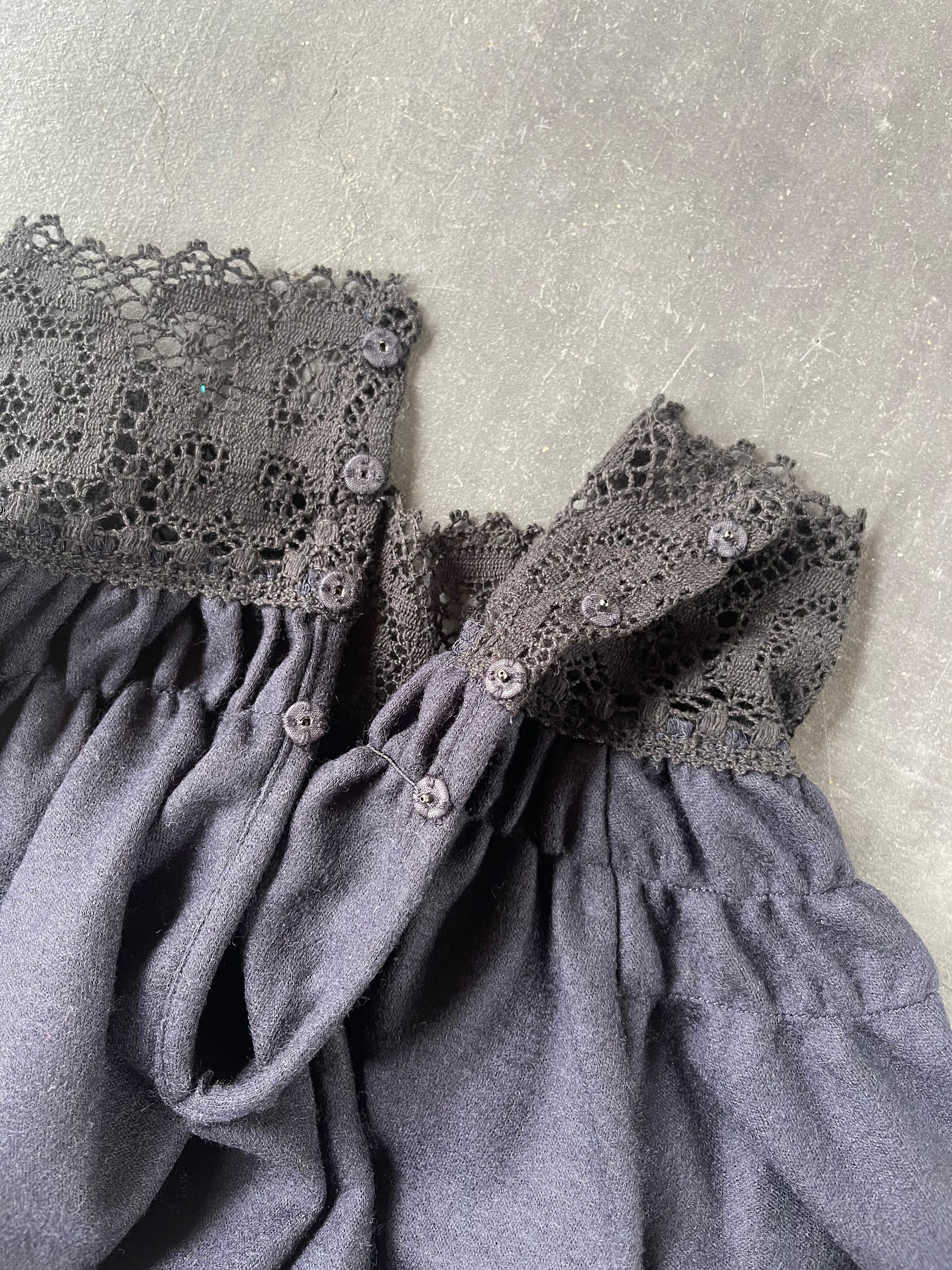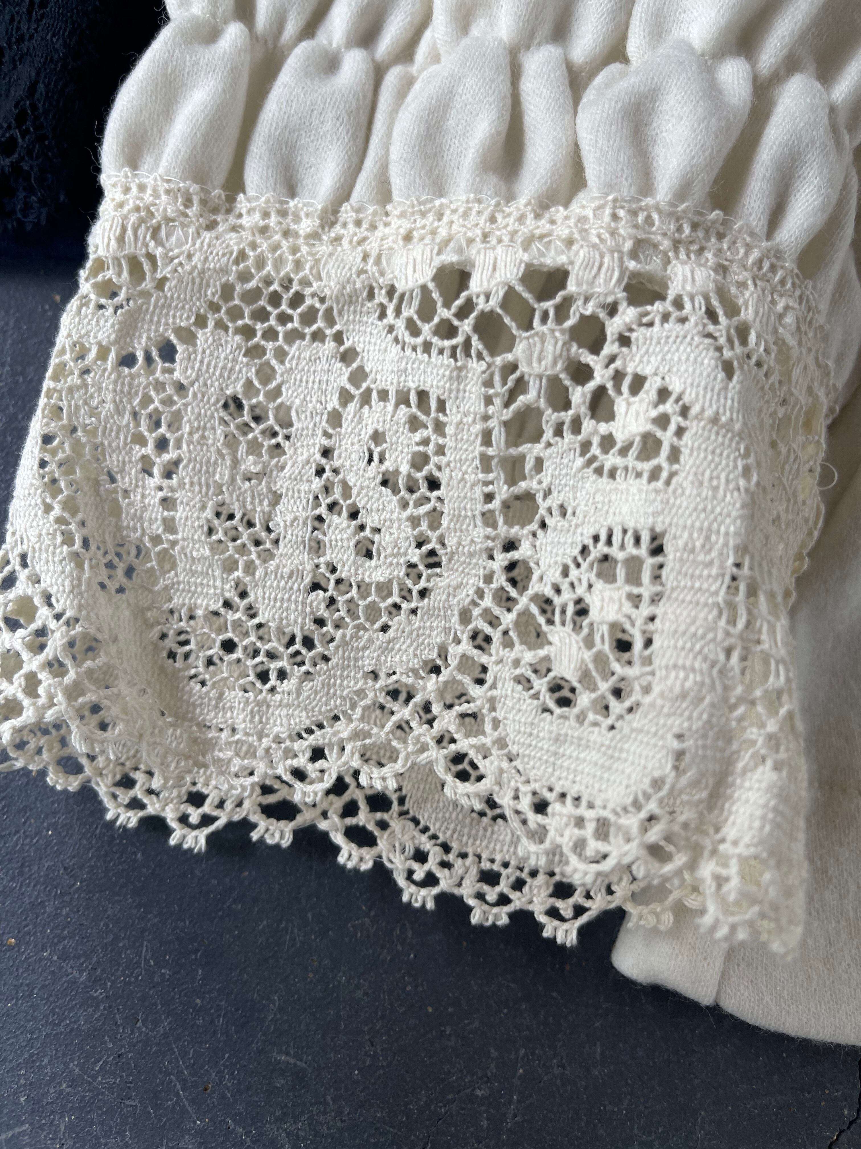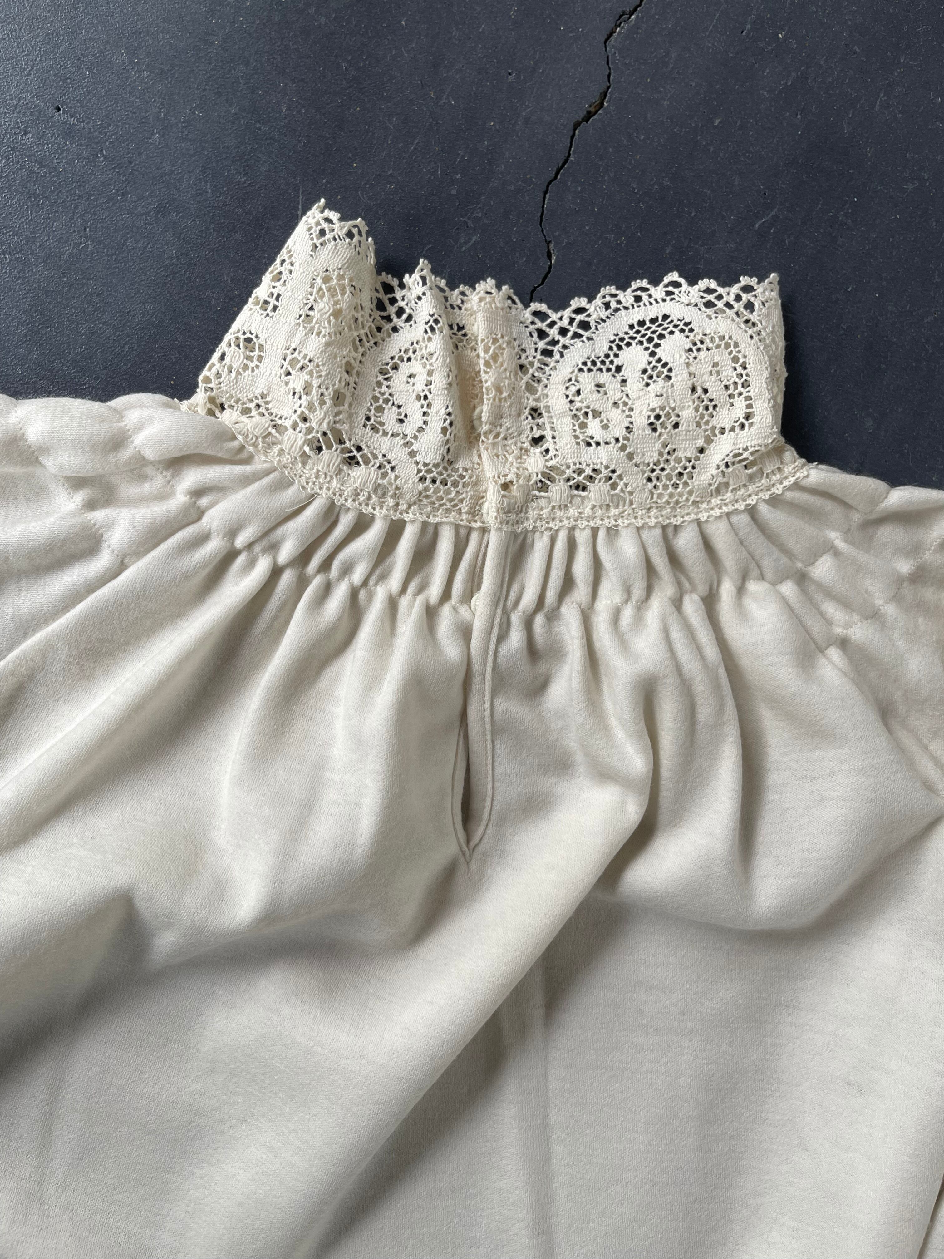 20 世紀初めに教会で着用されていた礼装用のスモックを参考にデザインされた女性らしいカットソーです。身頃にはサラッとした肌触りと伸縮性のあるウール天体を使用し、世界最古のレースメーカーである、英国クルニー社製の太番手の糸を使用した厚手のコットンレースを襟と袖口に配しています。クルニー