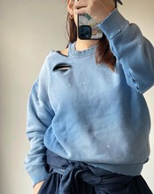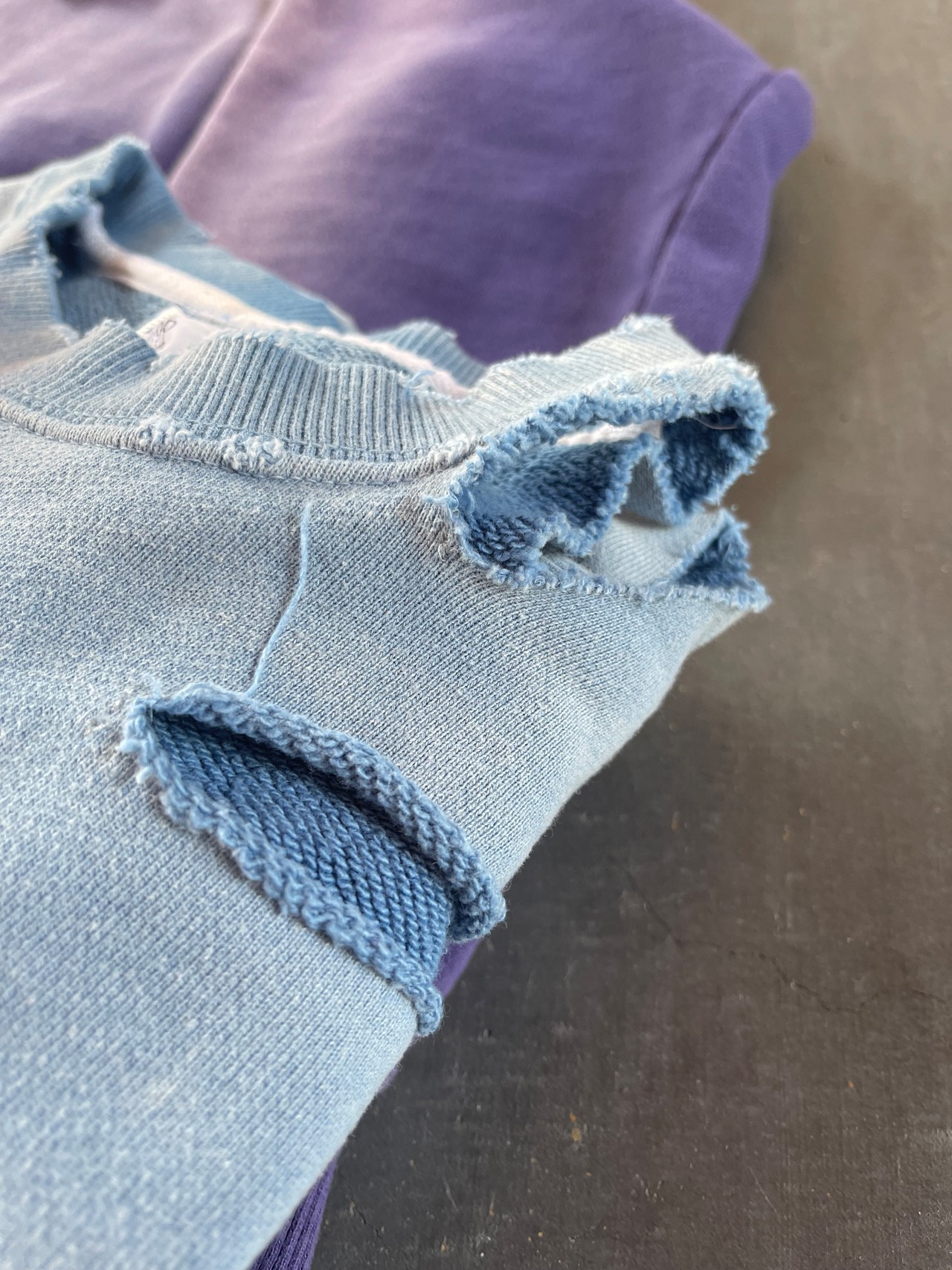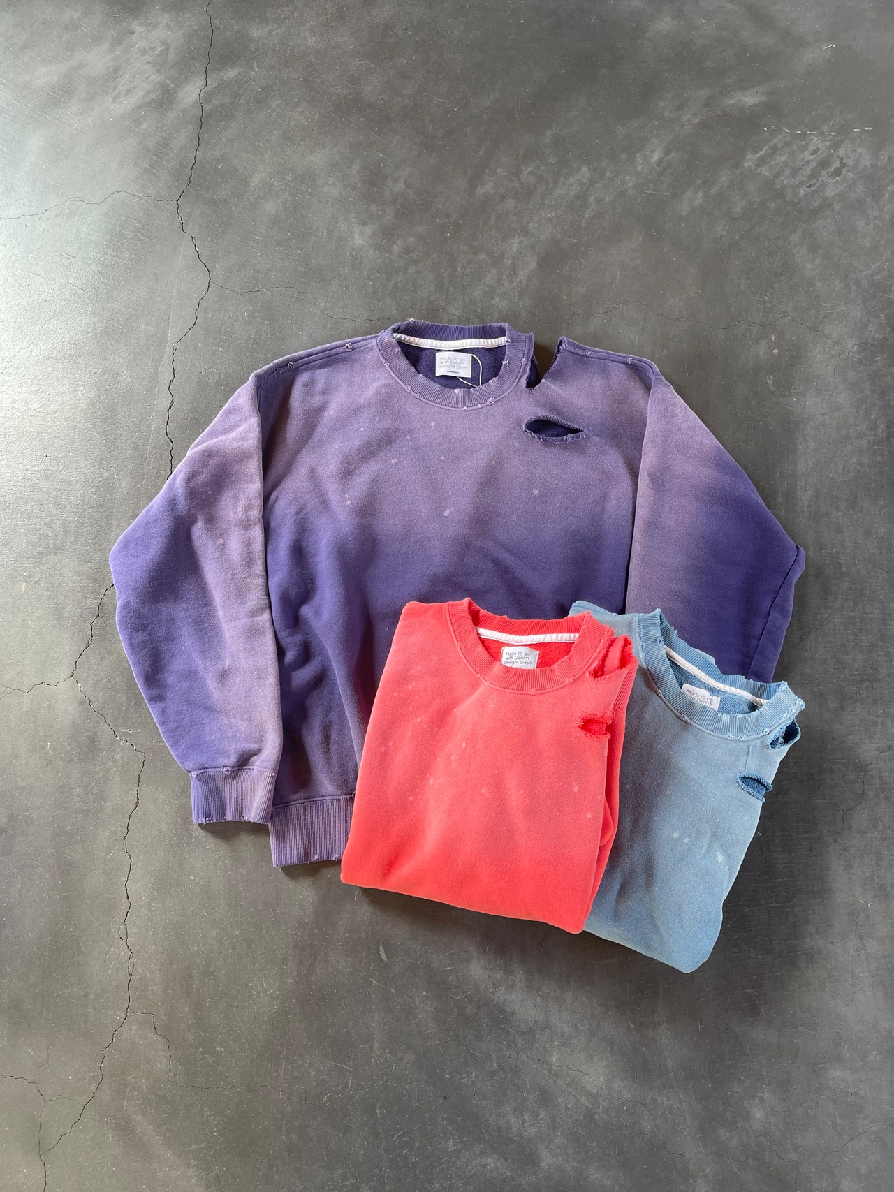 johnbullの新しいデニムラインである、denim delight daysより、10oz裏毛のベーシックなスウェットシャツに製品染め加工し、更に随所にカットオフ加工を施し、ヴィンテージの雰囲気を表現したスウェットとパーカーのご紹介です。