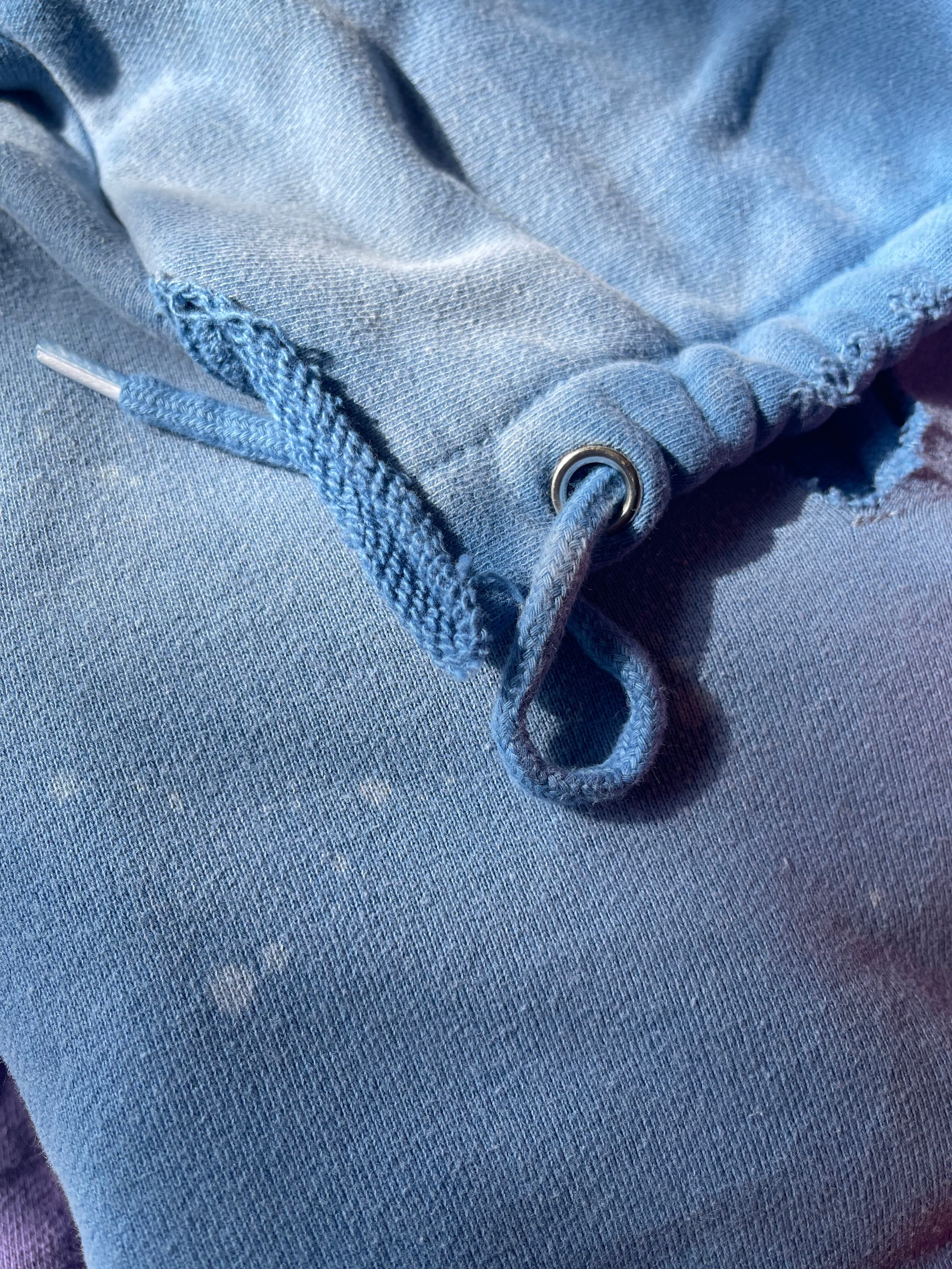 johnbullの新しいデニムラインである、denim delight daysより10oz裏毛のベーシックなスウェットパーカーに製品染め加工し、更に随所にカットオフ加工を施し、ヴィンテージの雰囲気を表現したパーカーのご紹介です。