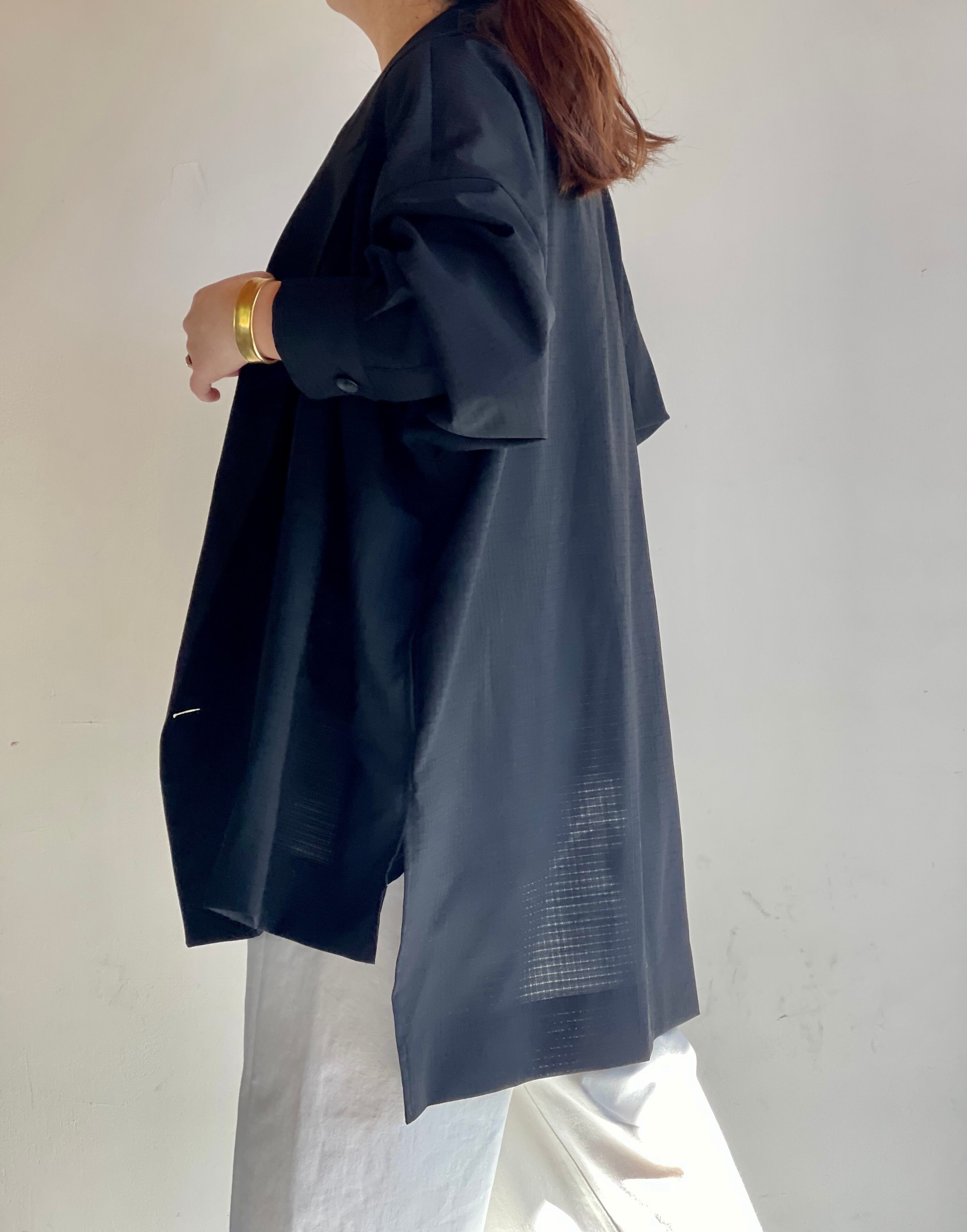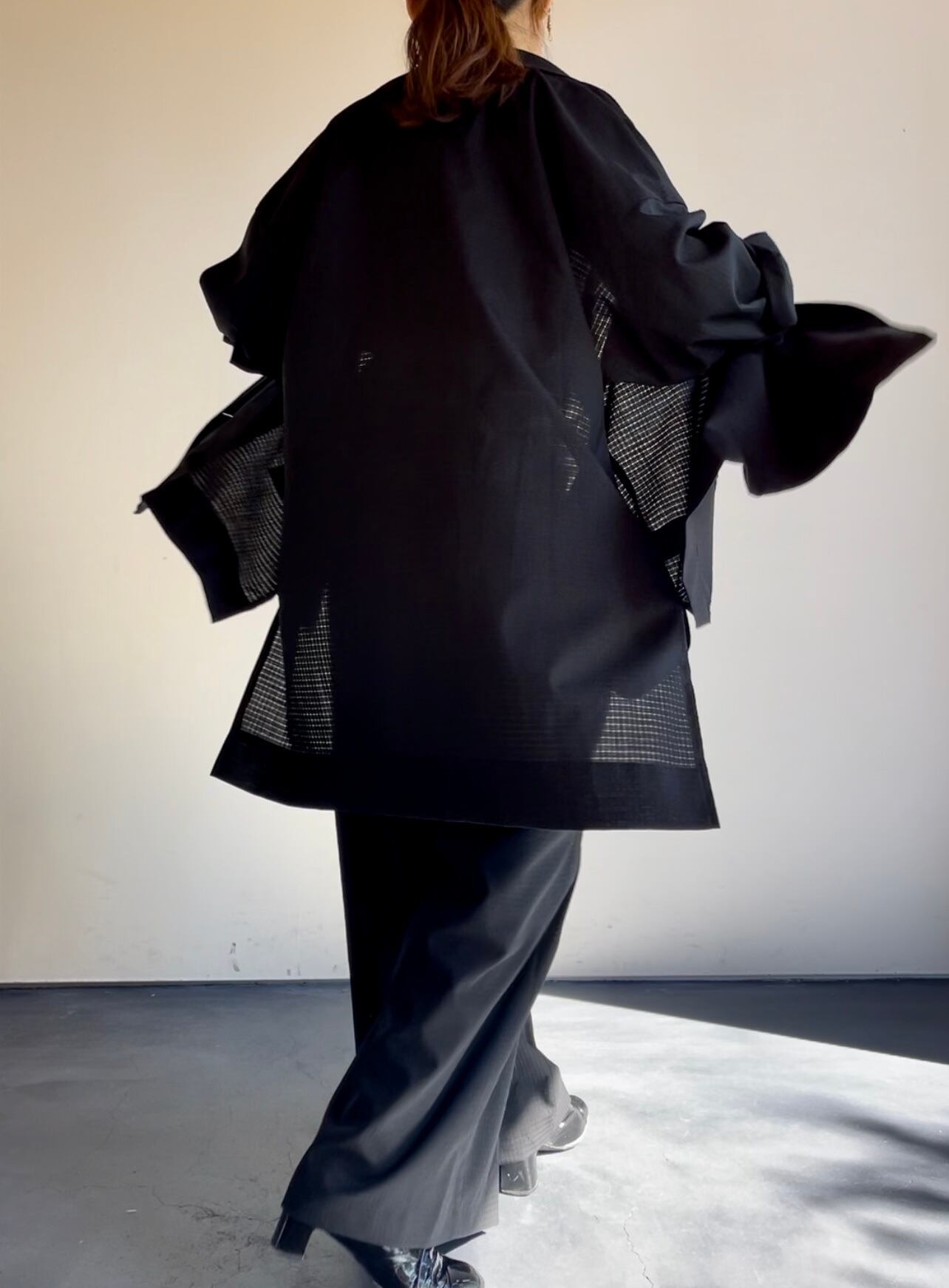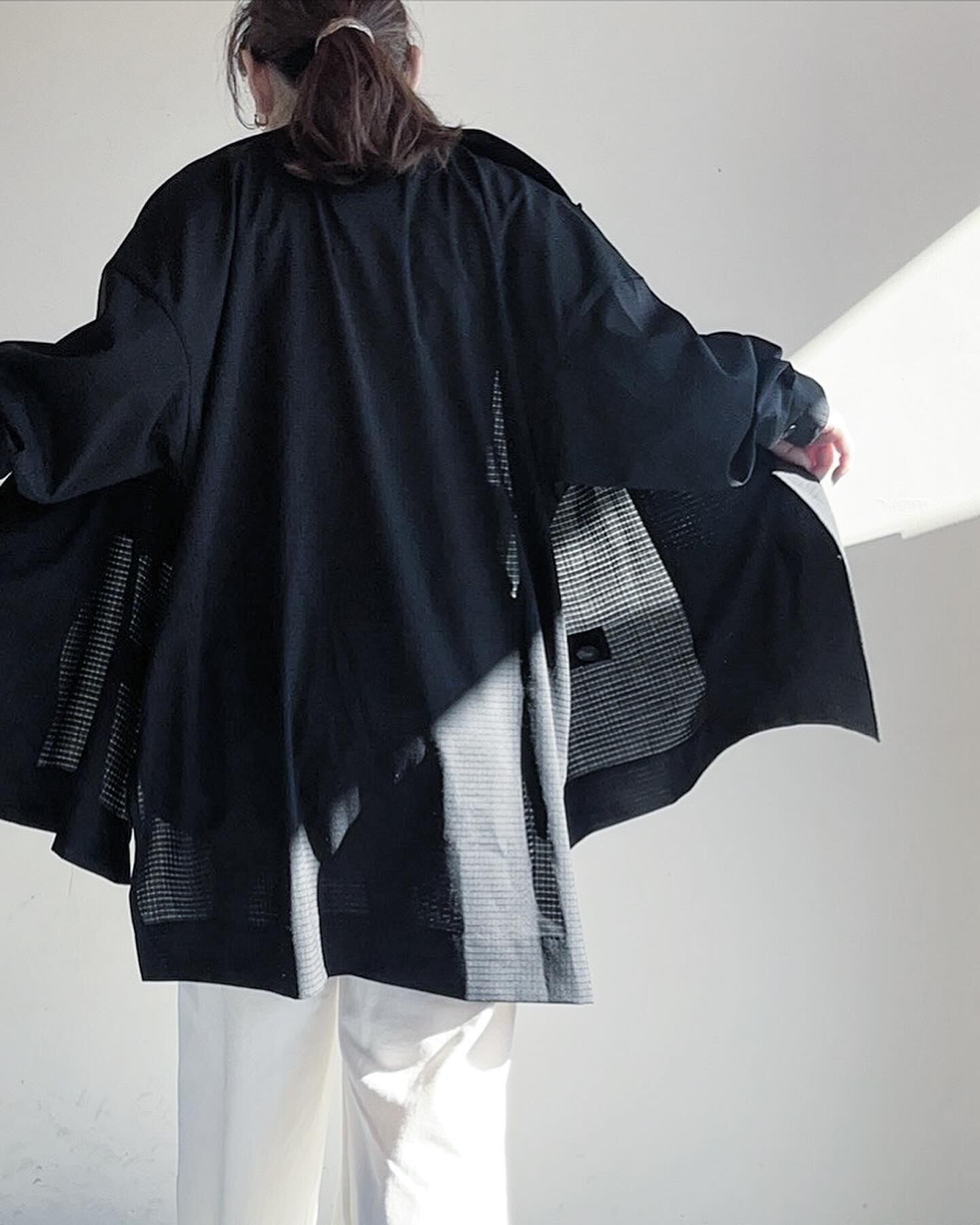 空羽織(アキハ)と呼ばれる、等間隔に糸を通さない透け箇所を作りながら織り上げるドットメッシュ調の特殊組織。見た目の通り通気性と軽量感に優れ、軽やかでエアリーな着心地を体感出来るうえ、撥水・防シワ・ストレッチ・ウォッシャブルという機能満載な万能素材。スポーティーな印象の機能素材をウール混でドレスシーンに充分対応する表情に仕上げて表示に従い手洗い可。※J07/J08はドライクリーニング。