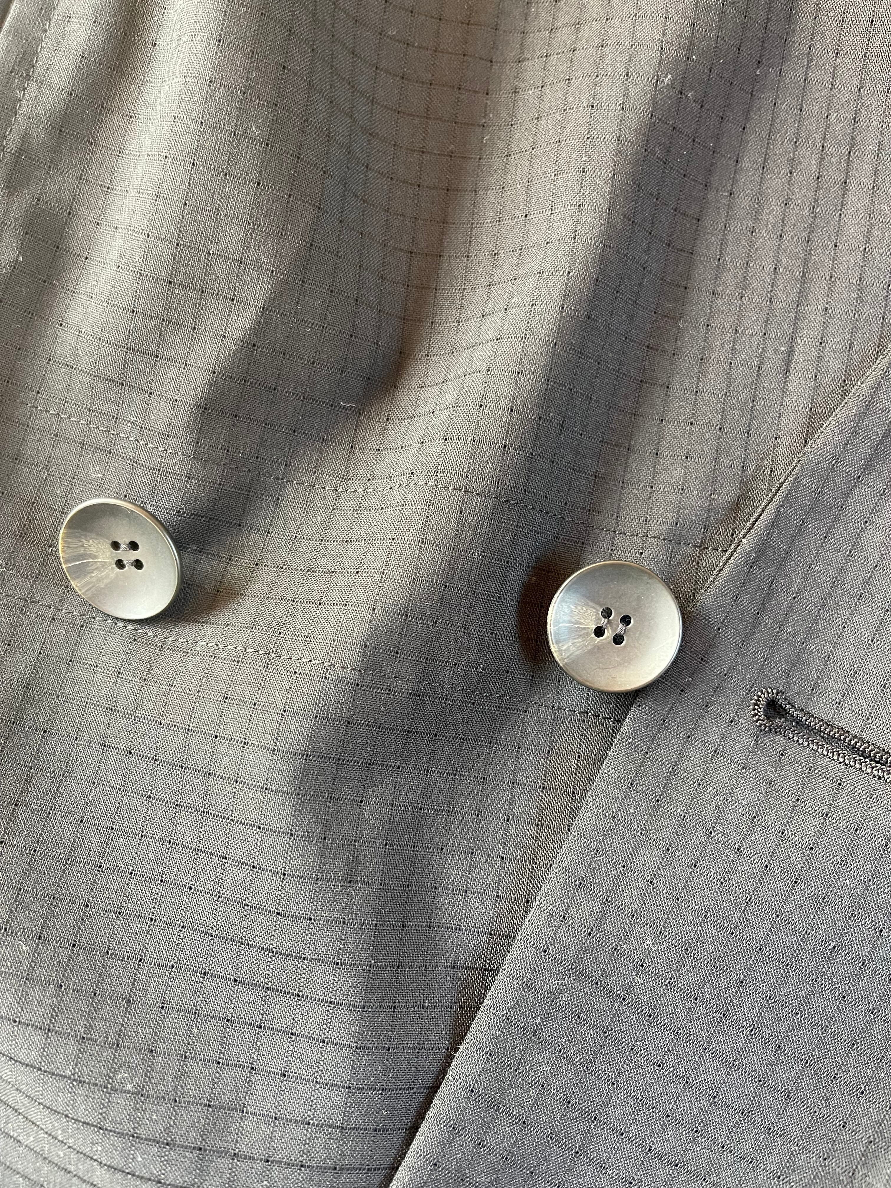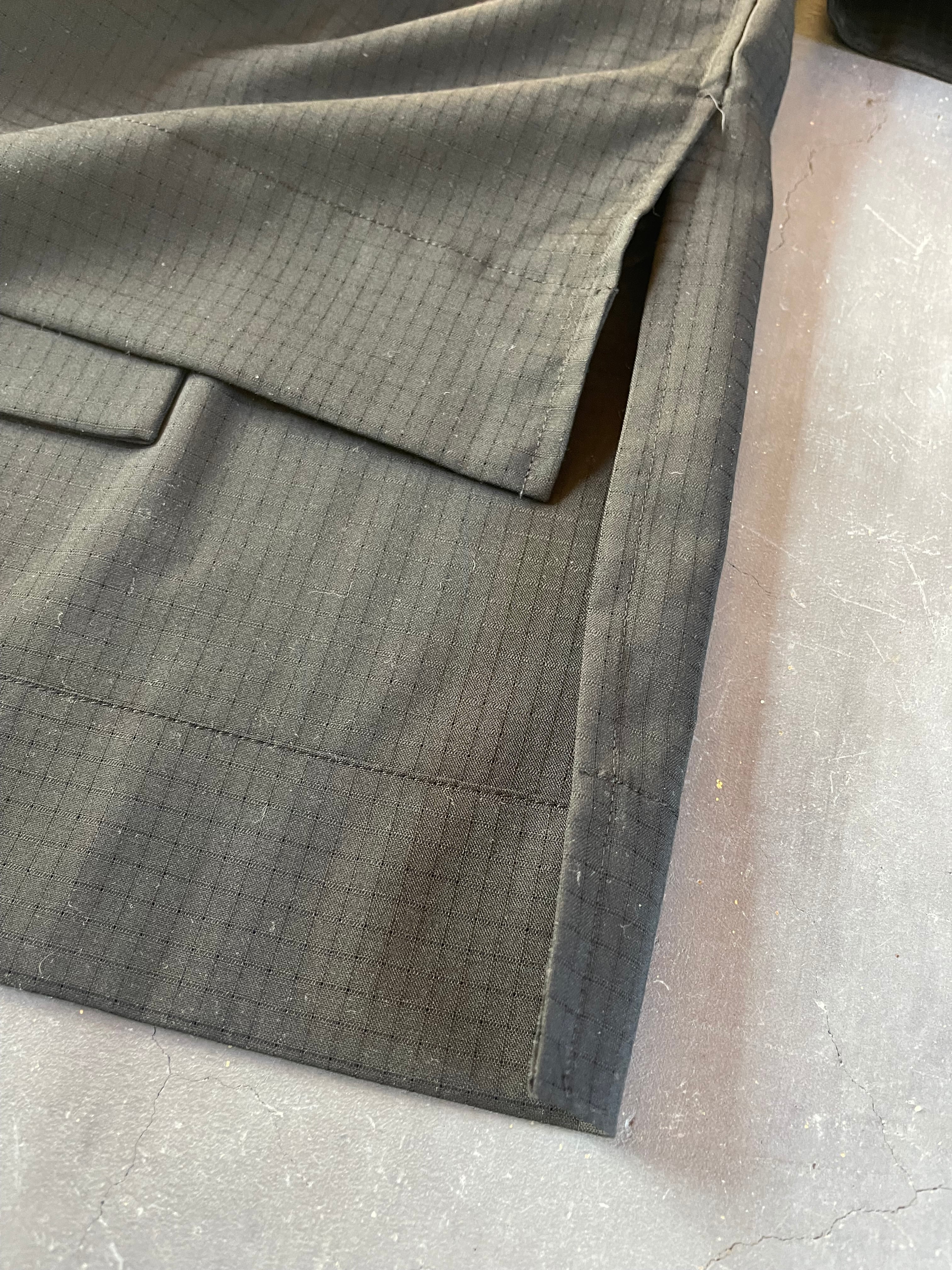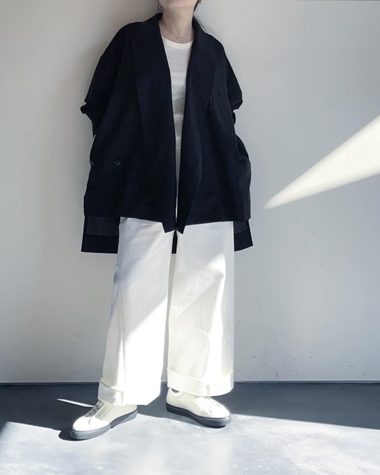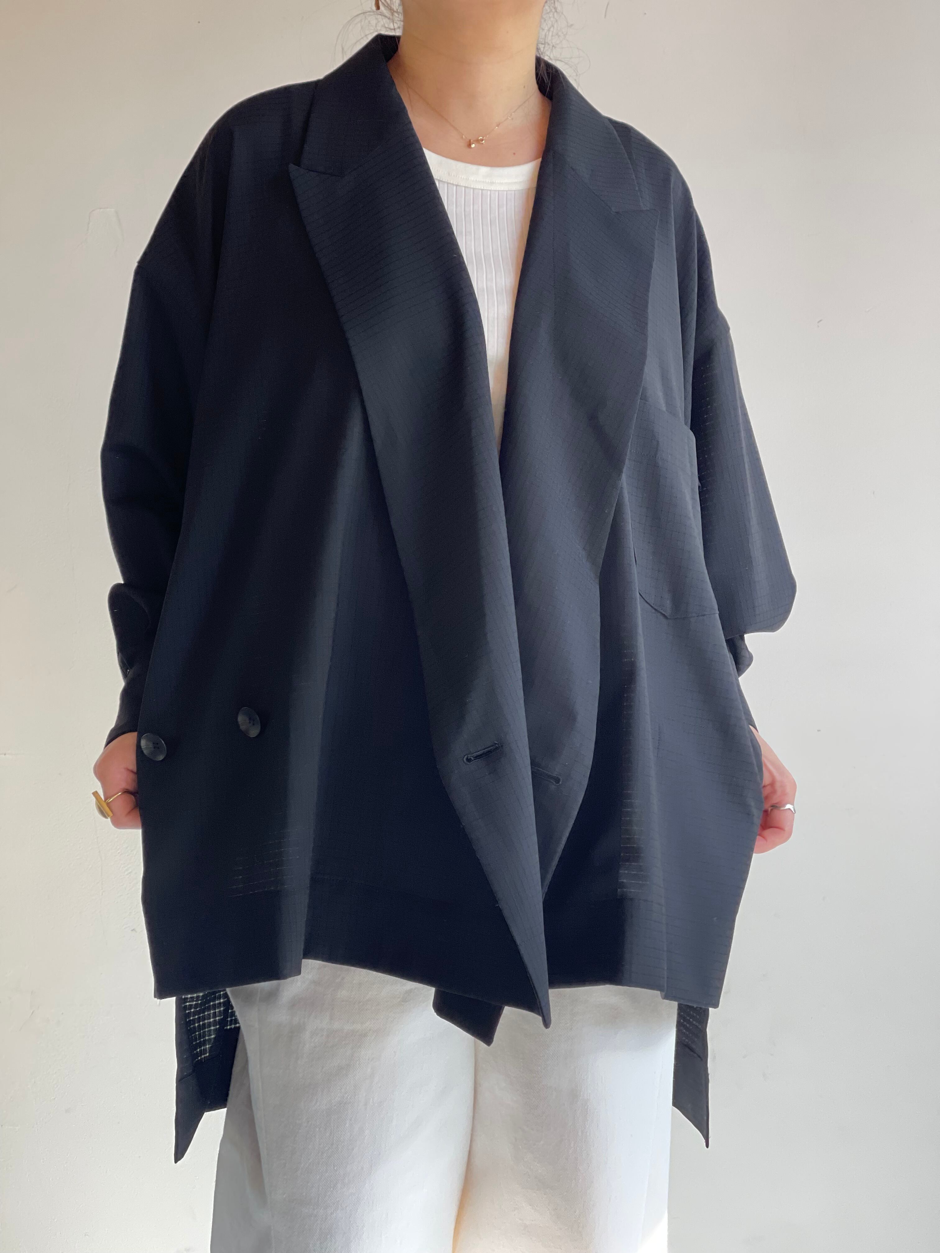 空羽織(アキハ)と呼ばれる、等間隔に糸を通さない透け箇所を作りながら織り上げるドットメッシュ調の特殊組織。見た目の通り通気性と軽量感に優れ、軽やかでエアリーな着心地を体感出来るうえ、撥水・防シワ・ストレッチ・ウォッシャブルという機能満載な万能素材。スポーティーな印象の機能素材をウール混でドレスシーンに充分対応する表情に仕上げて表示に従い手洗い可。※J07/J08はドライクリーニング。