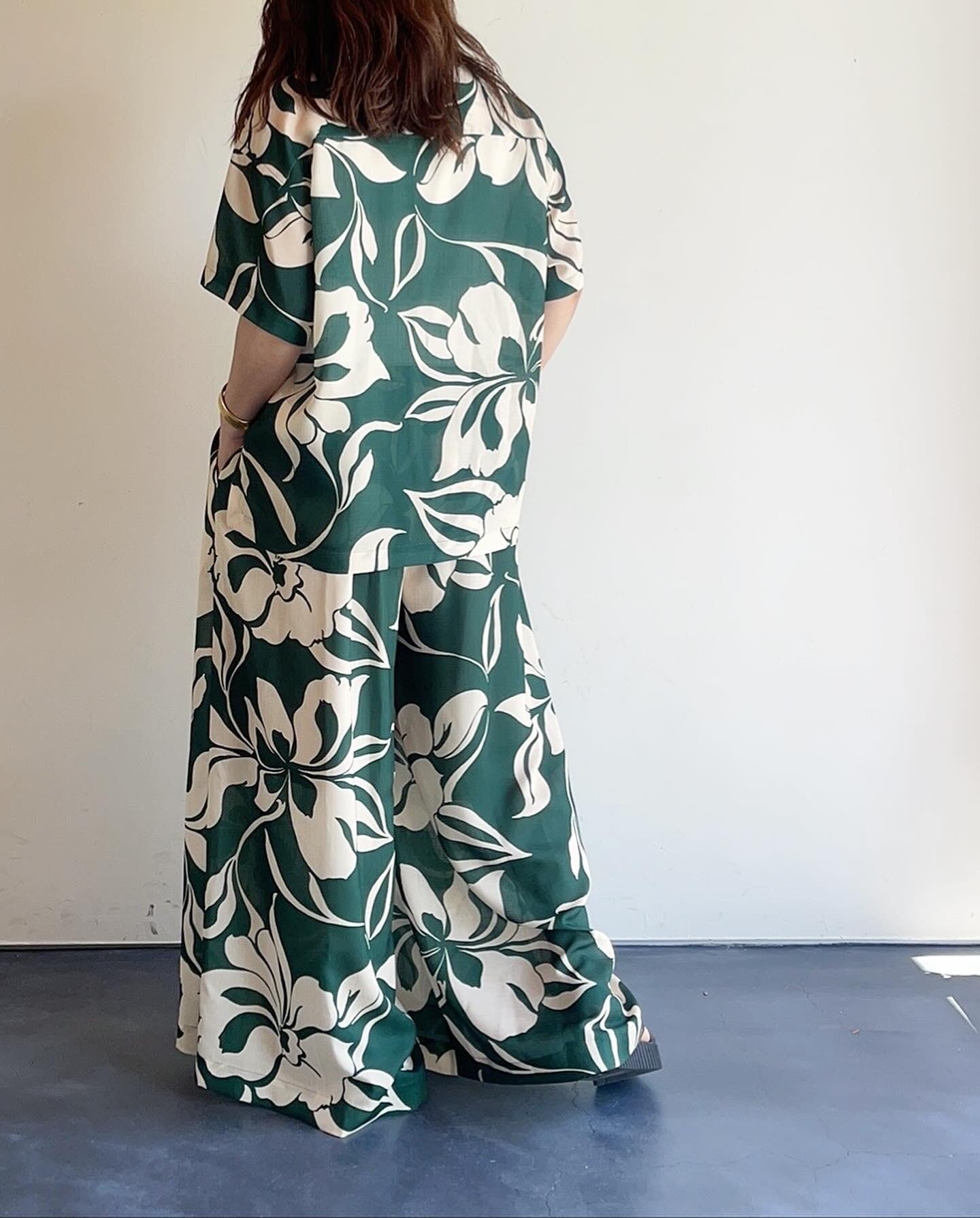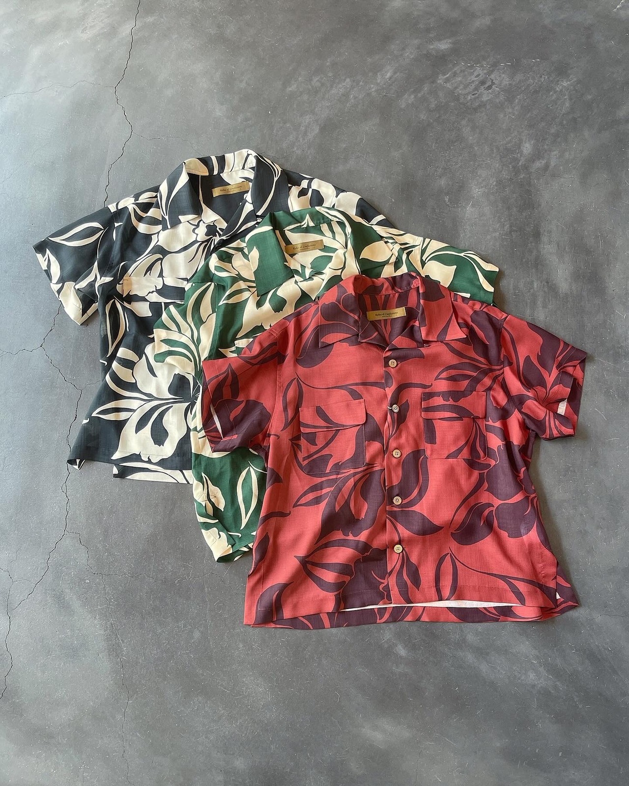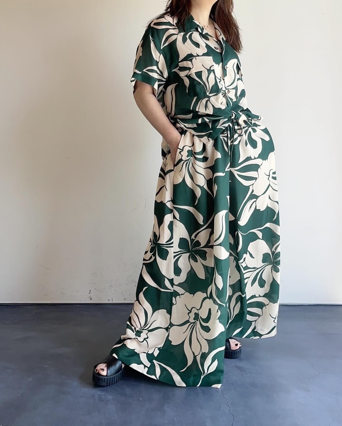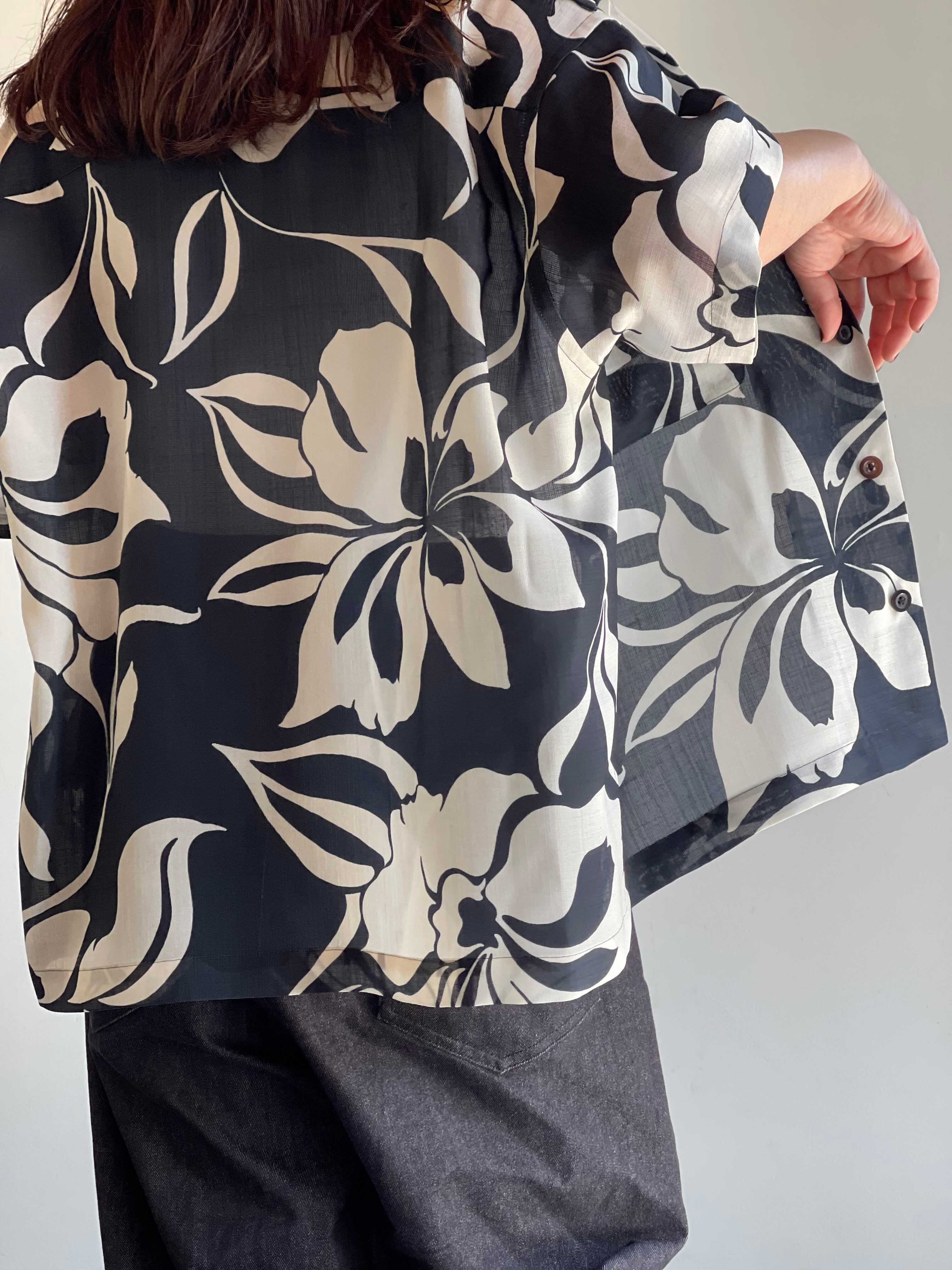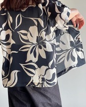 ティファイファイ(Tifaifai)と呼ばれるタヒチアン・キルトを象徴するグラフィカルで大柄なフローラルモチーフからインスパイアされた図案をシャリ感あるドライタッチなシャークスキンにプリントしたオリジナル素材。表示に従い手洗い可。