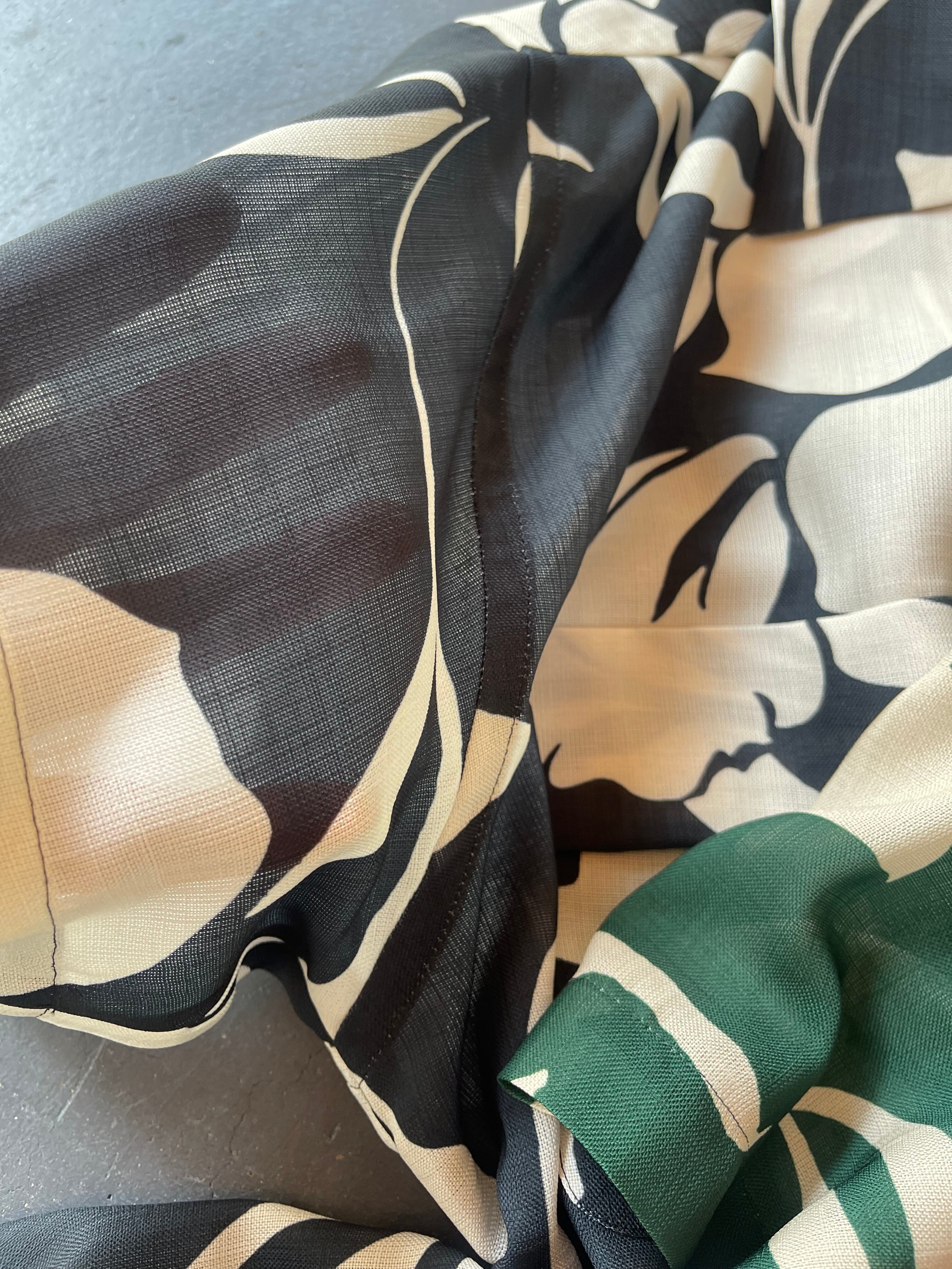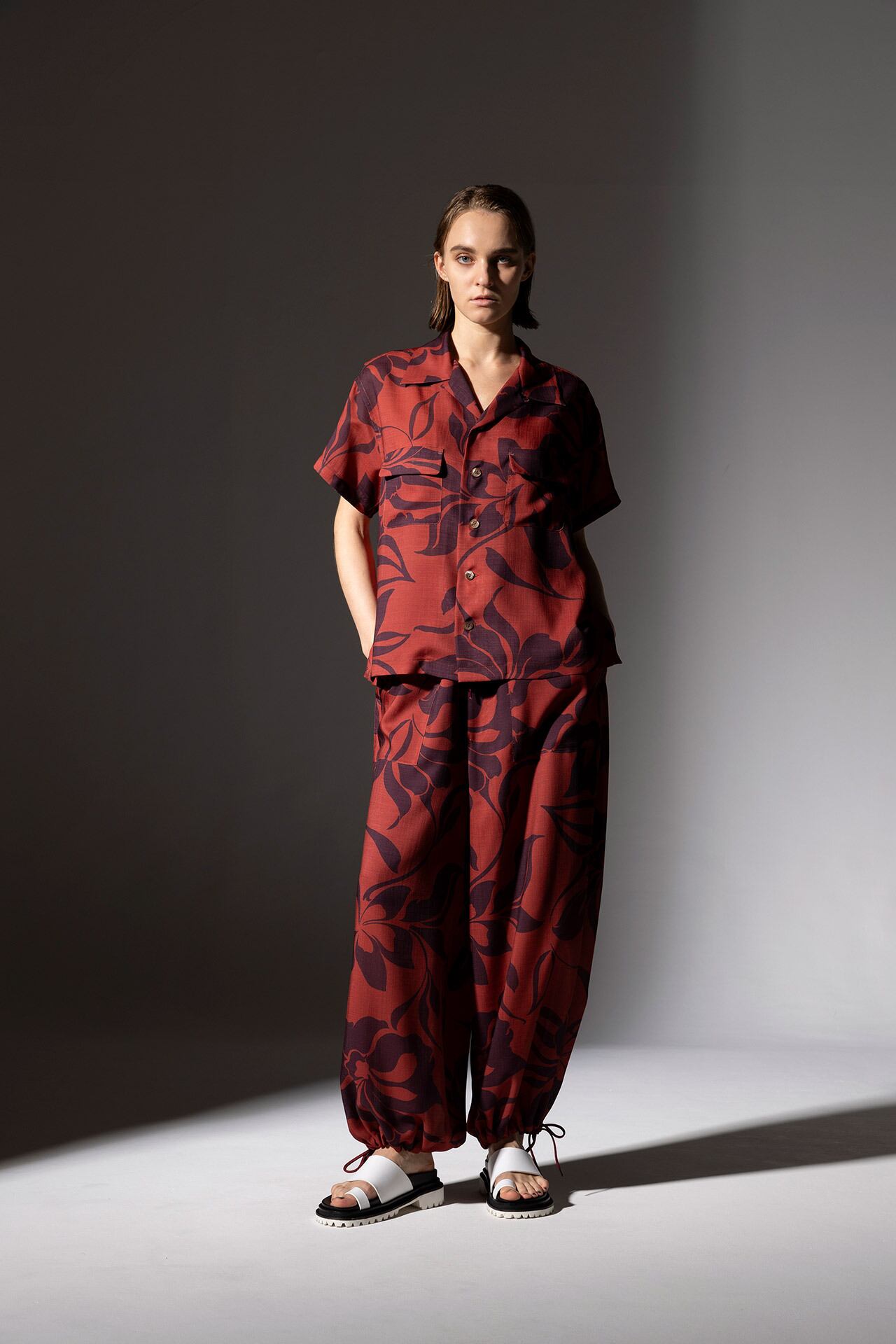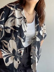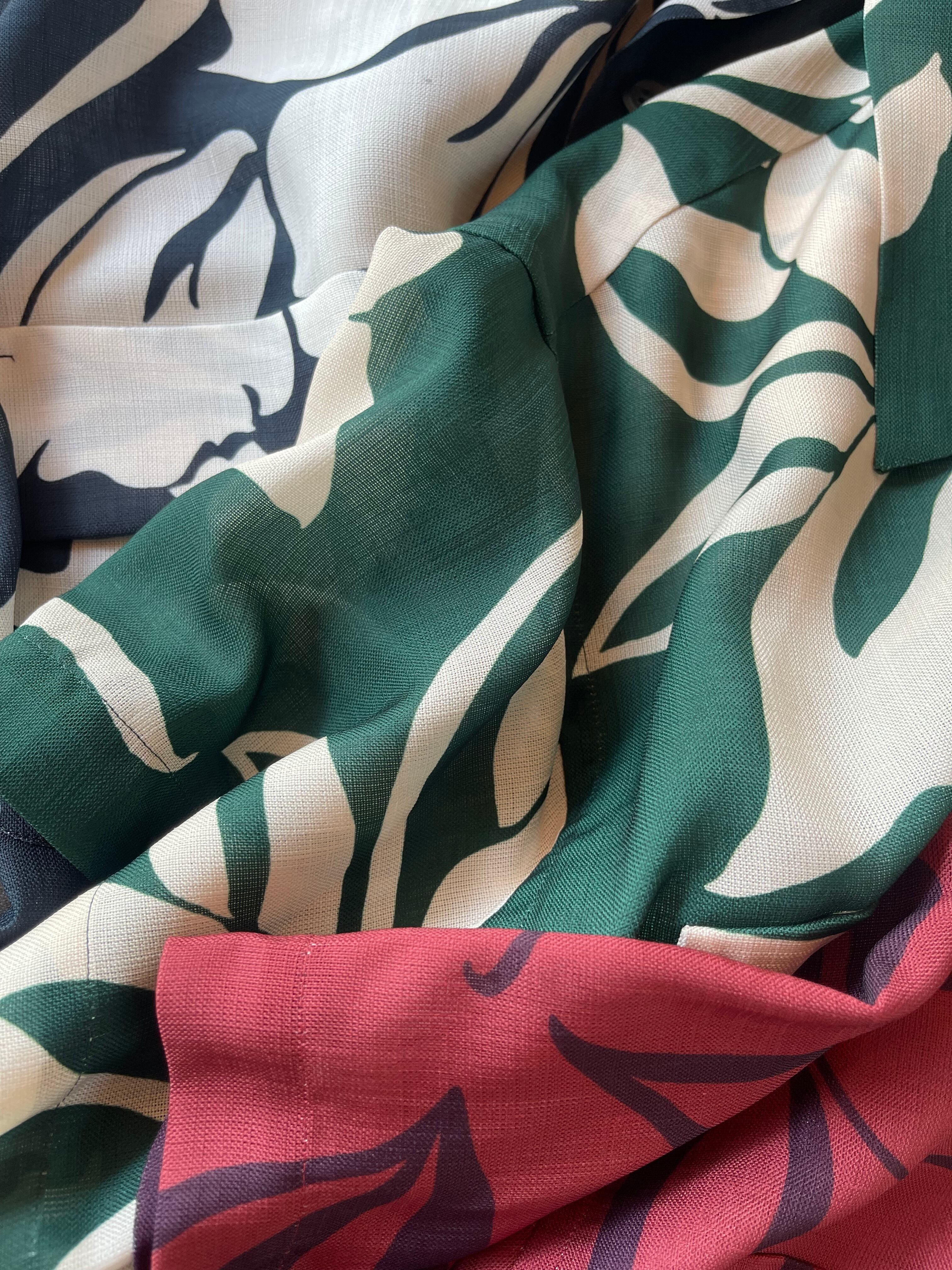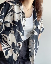 ティファイファイ(Tifaifai)と呼ばれるタヒチアン・キルトを象徴するグラフィカルで大柄なフローラルモチーフからインスパイアされた図案をシャリ感あるドライタッチなシャークスキンにプリントしたオリジナル素材。表示に従い手洗い可。