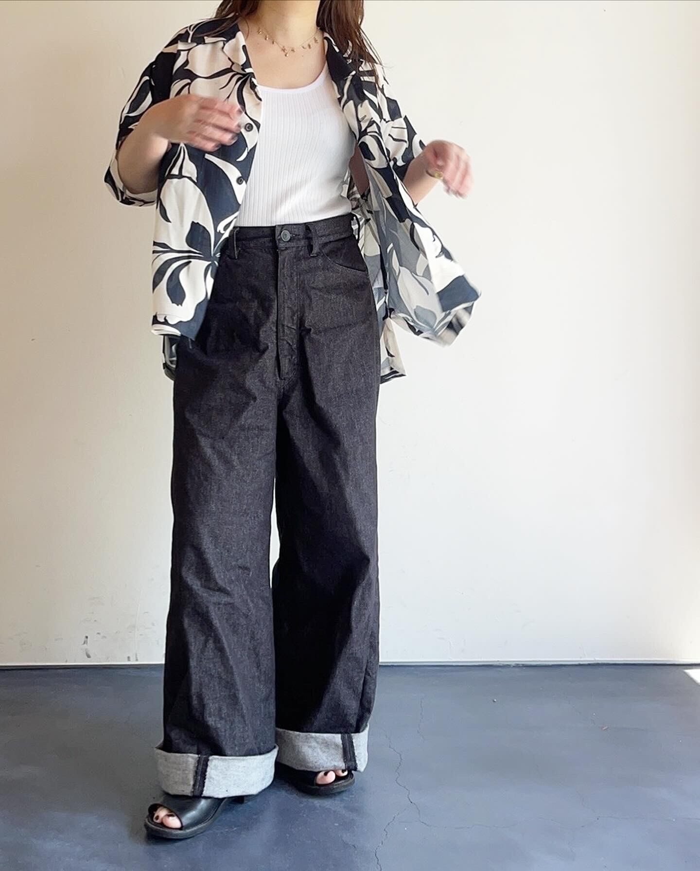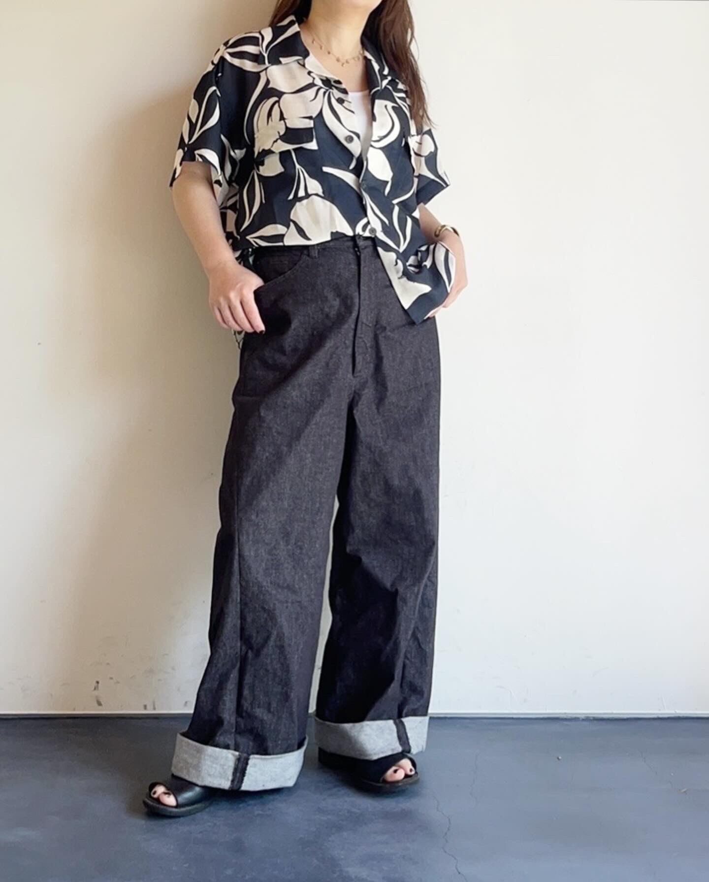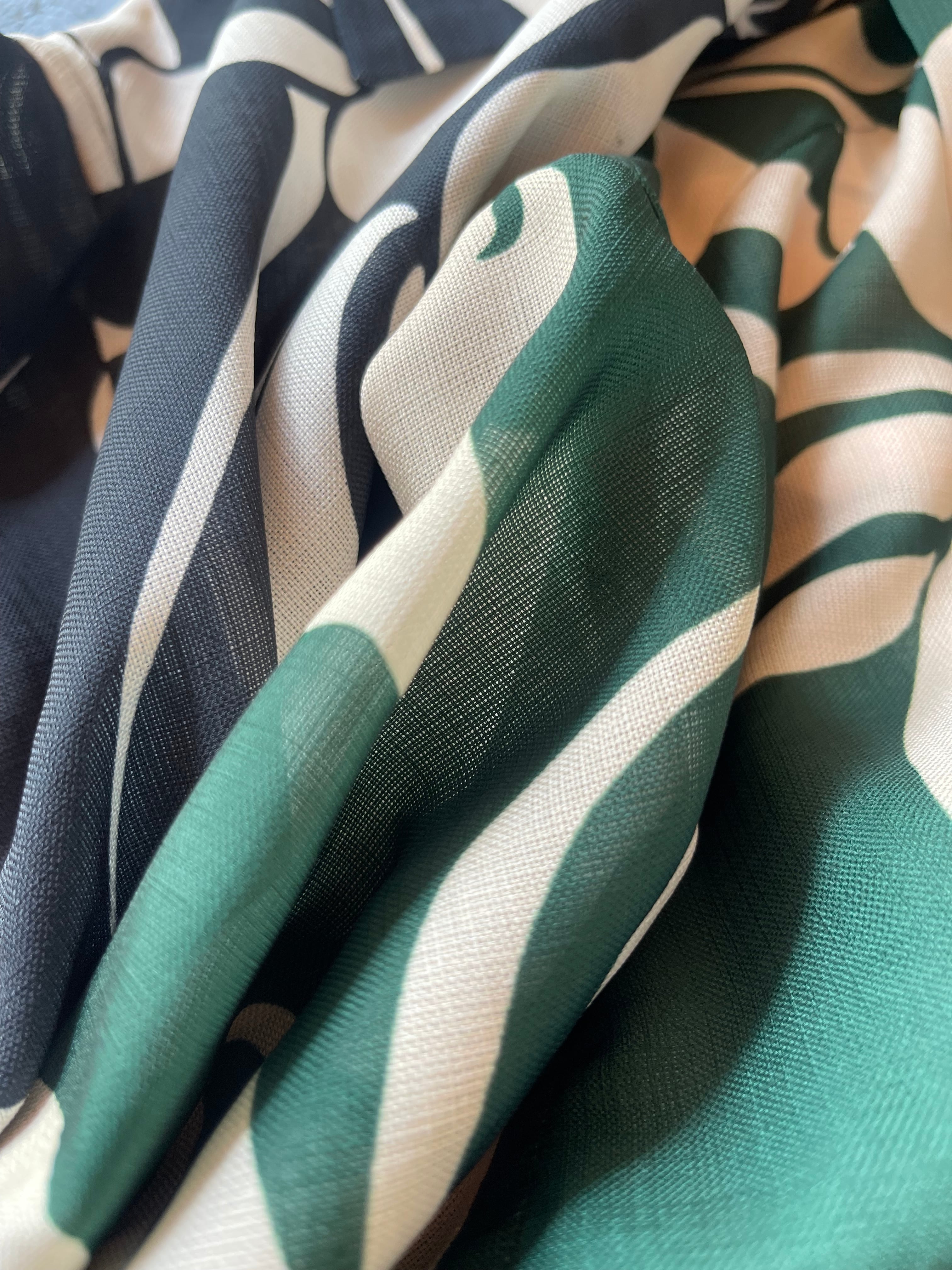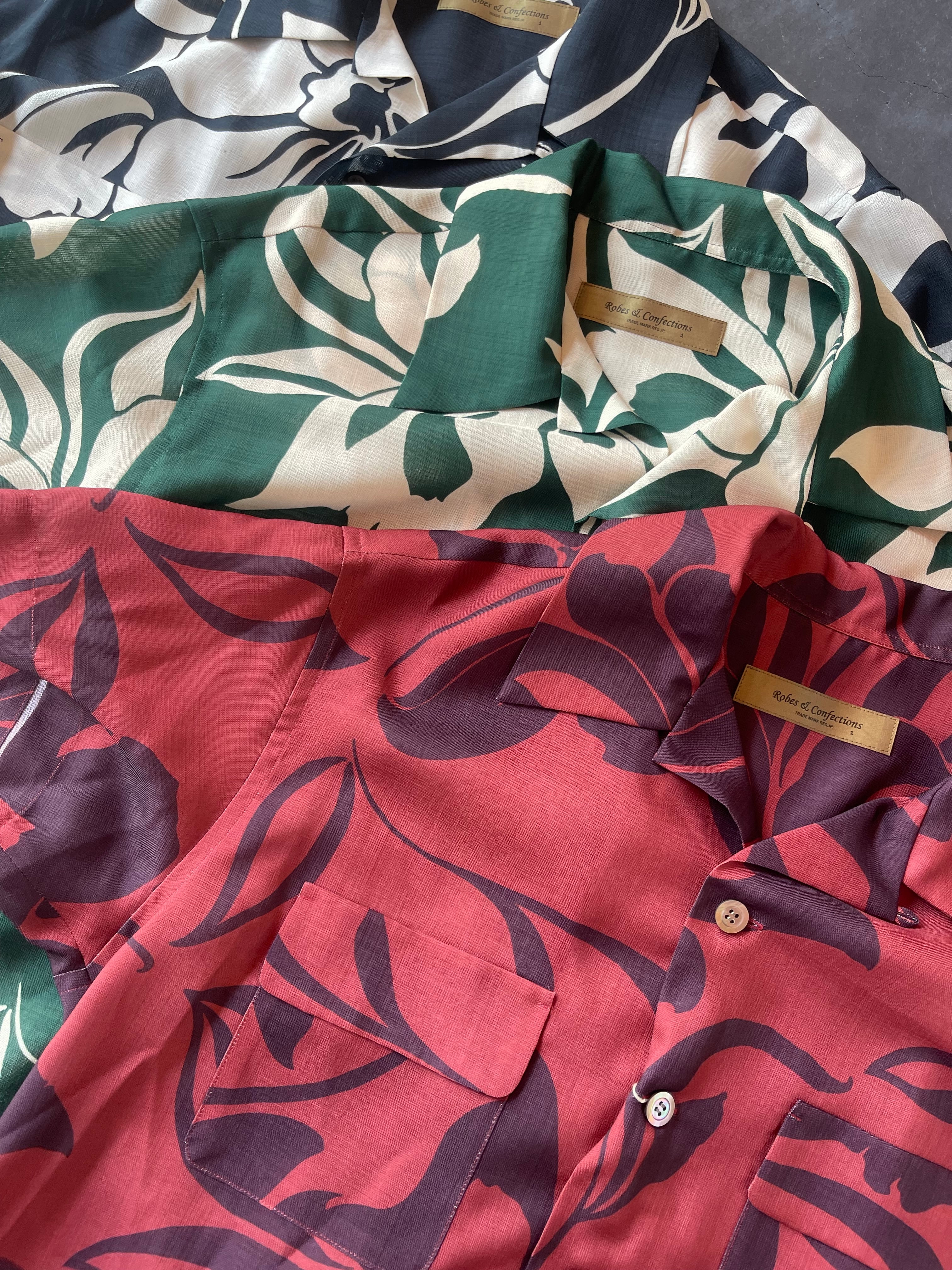 ティファイファイ(Tifaifai)と呼ばれるタヒチアン・キルトを象徴するグラフィカルで大柄なフローラルモチーフからインスパイアされた図案をシャリ感あるドライタッチなシャークスキンにプリントしたオリジナル素材。表示に従い手洗い可。