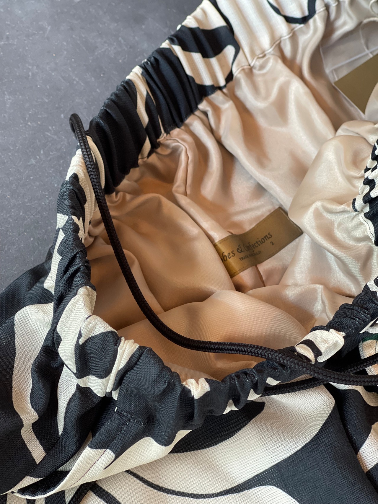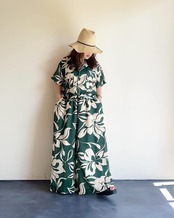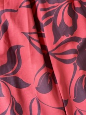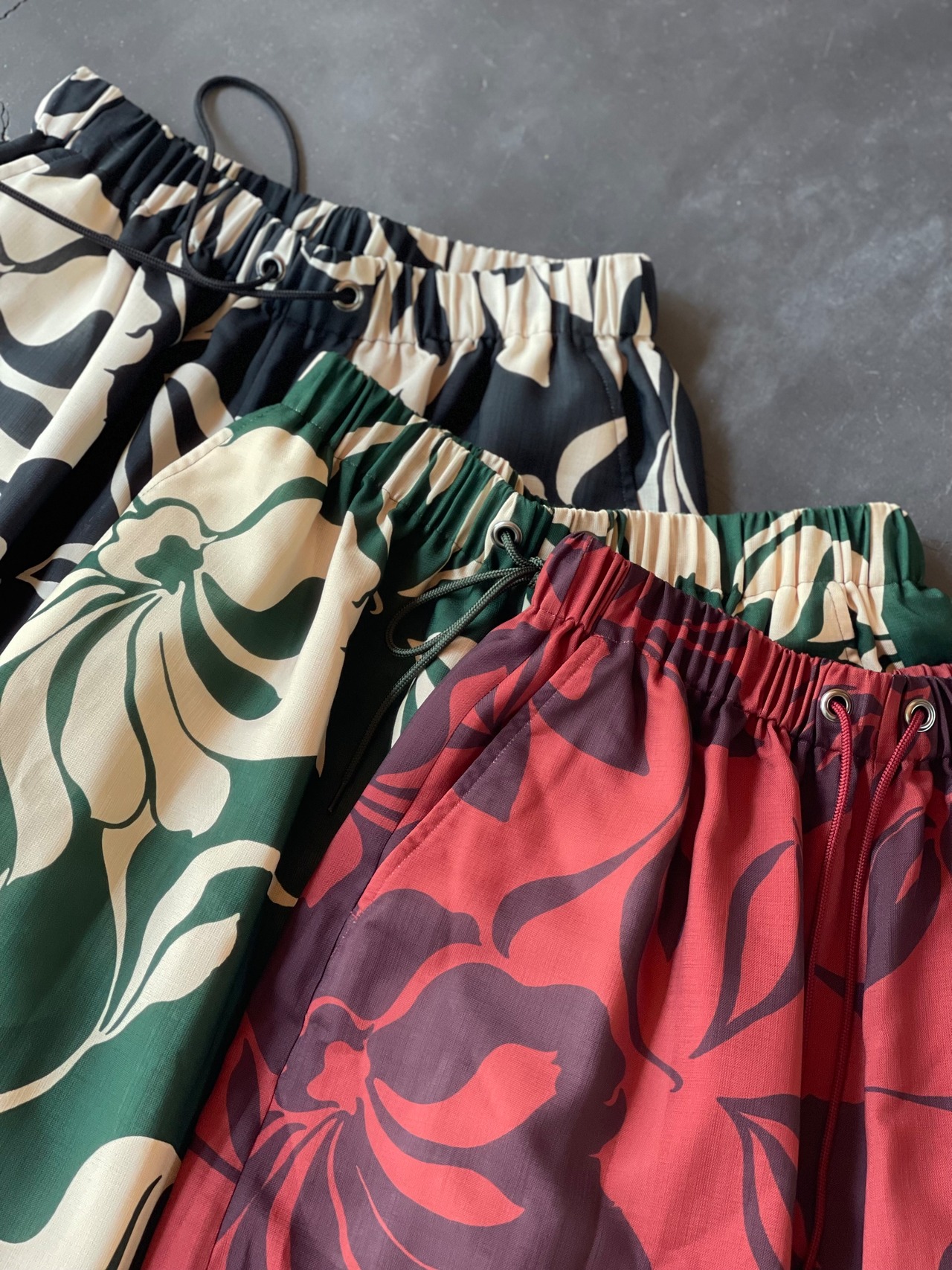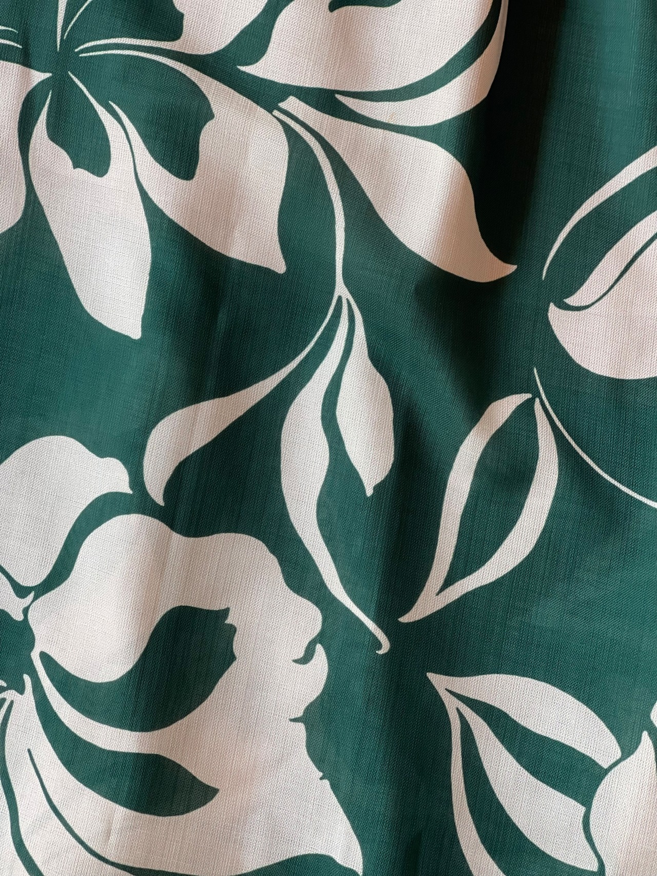 ティファイファイ(Tifaifai)と呼ばれるタヒチアン・キルトを象徴するグラフィカルで大柄なフローラルモチーフからインスパイアされた図案をシャリ感あるドライタッチなシャークスキンにプリントしたオリジナル素材。表示に従い手洗い可。