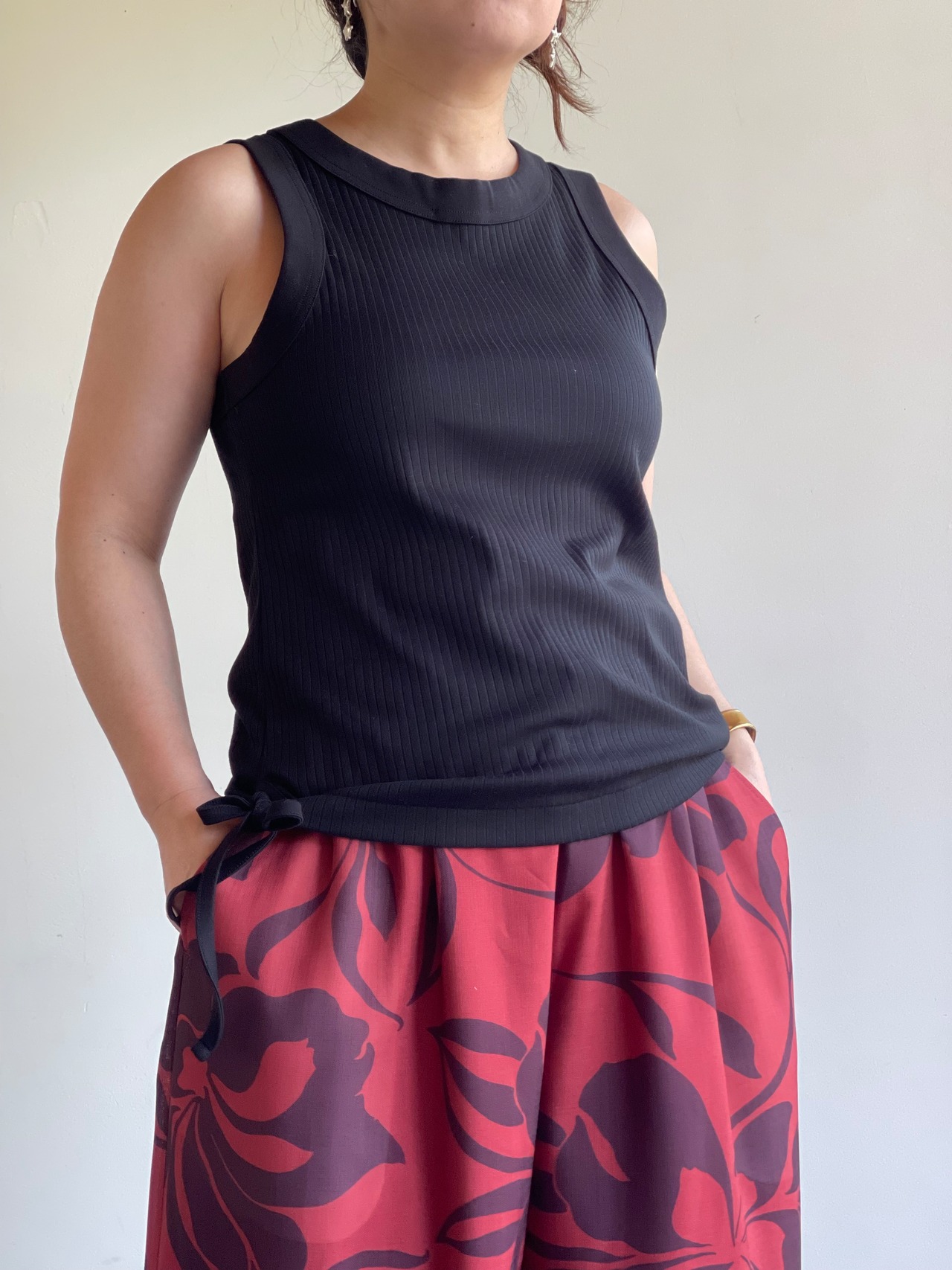 鮮やかに染色されナチュラルな伸縮性を持つオリジナル針抜きフライスジャージー。表示に従い手洗い可。