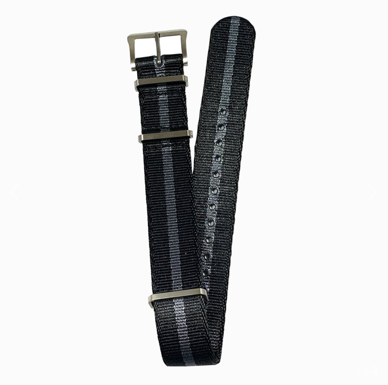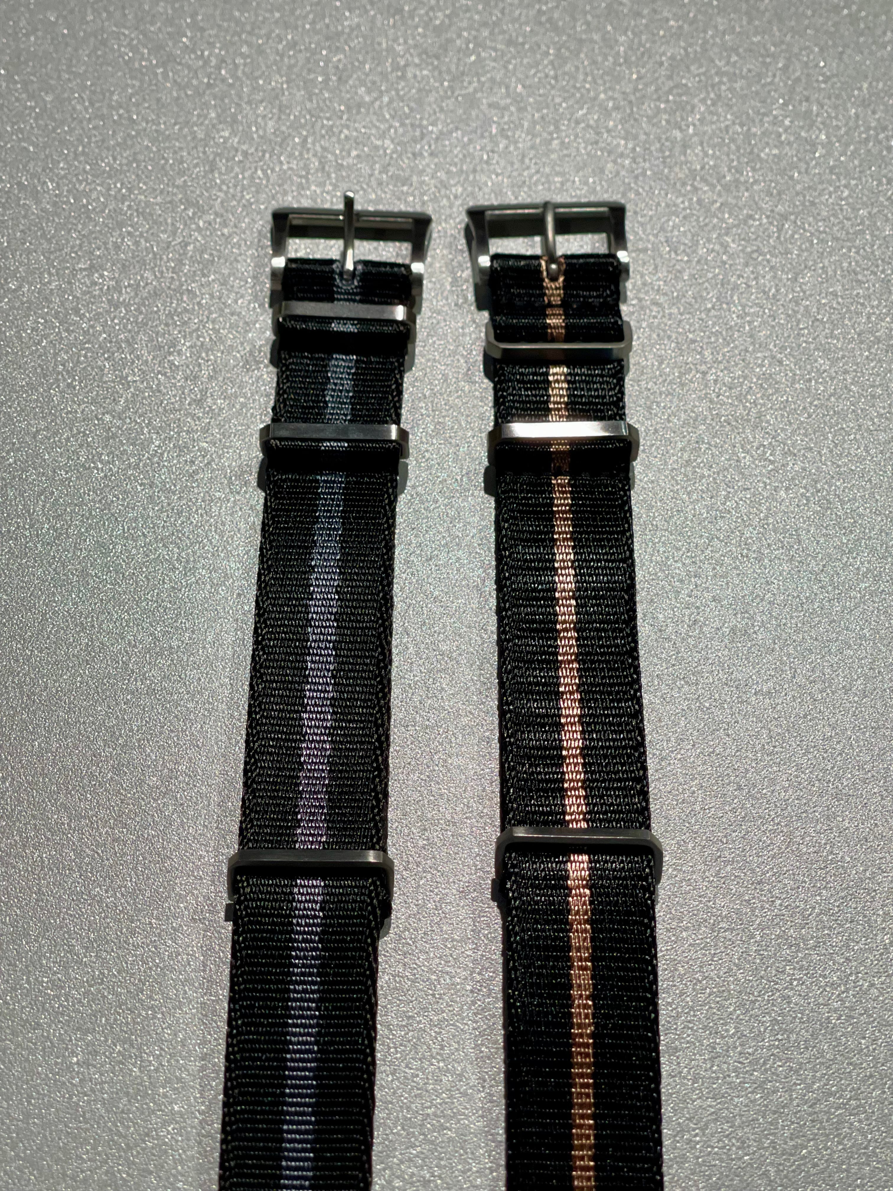 シートベルト素材の高級ナイロン G10 / NATOタイプ 黒・ライトブラウン(アイボリー)色 1本ラインストラップです。表面はシルク調で光沢が有ります。
