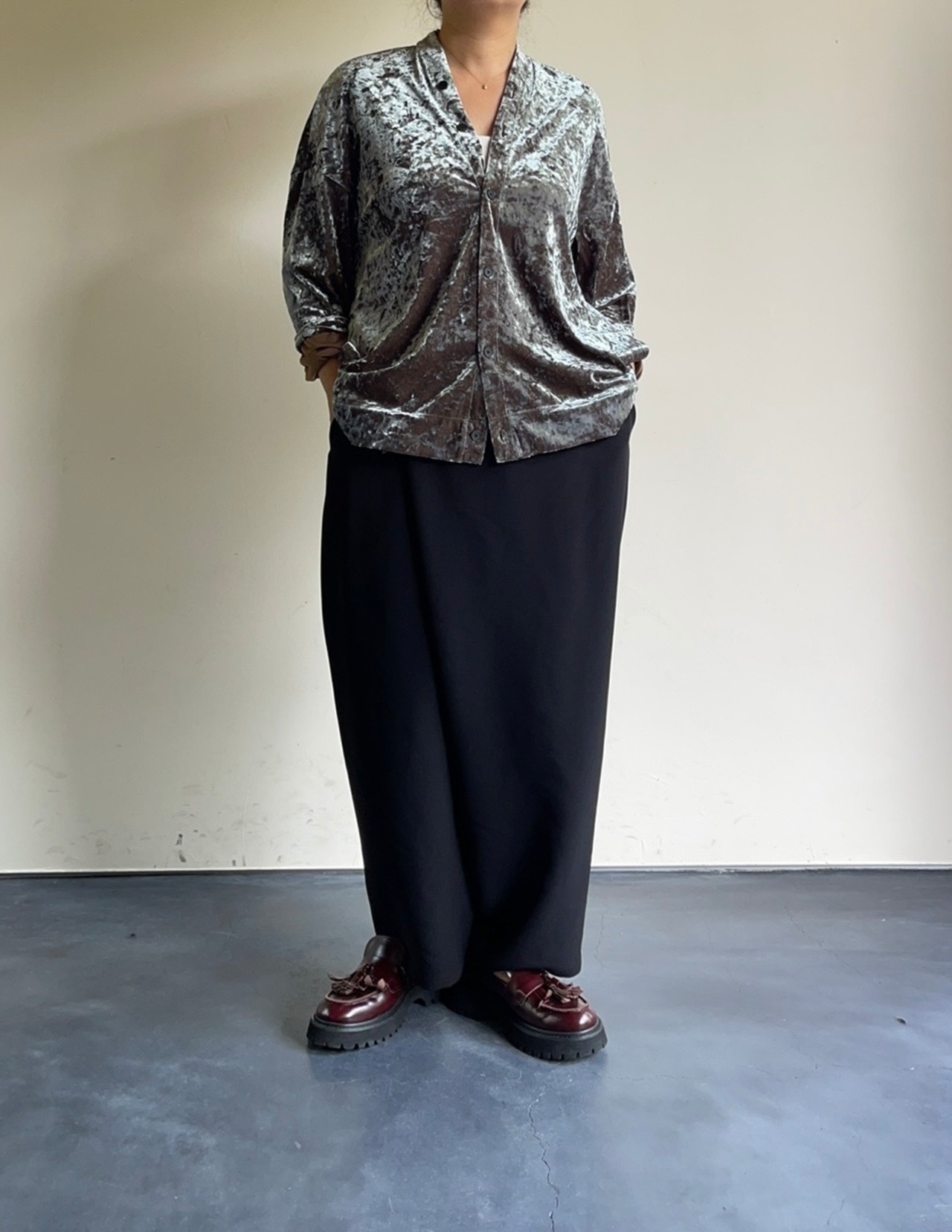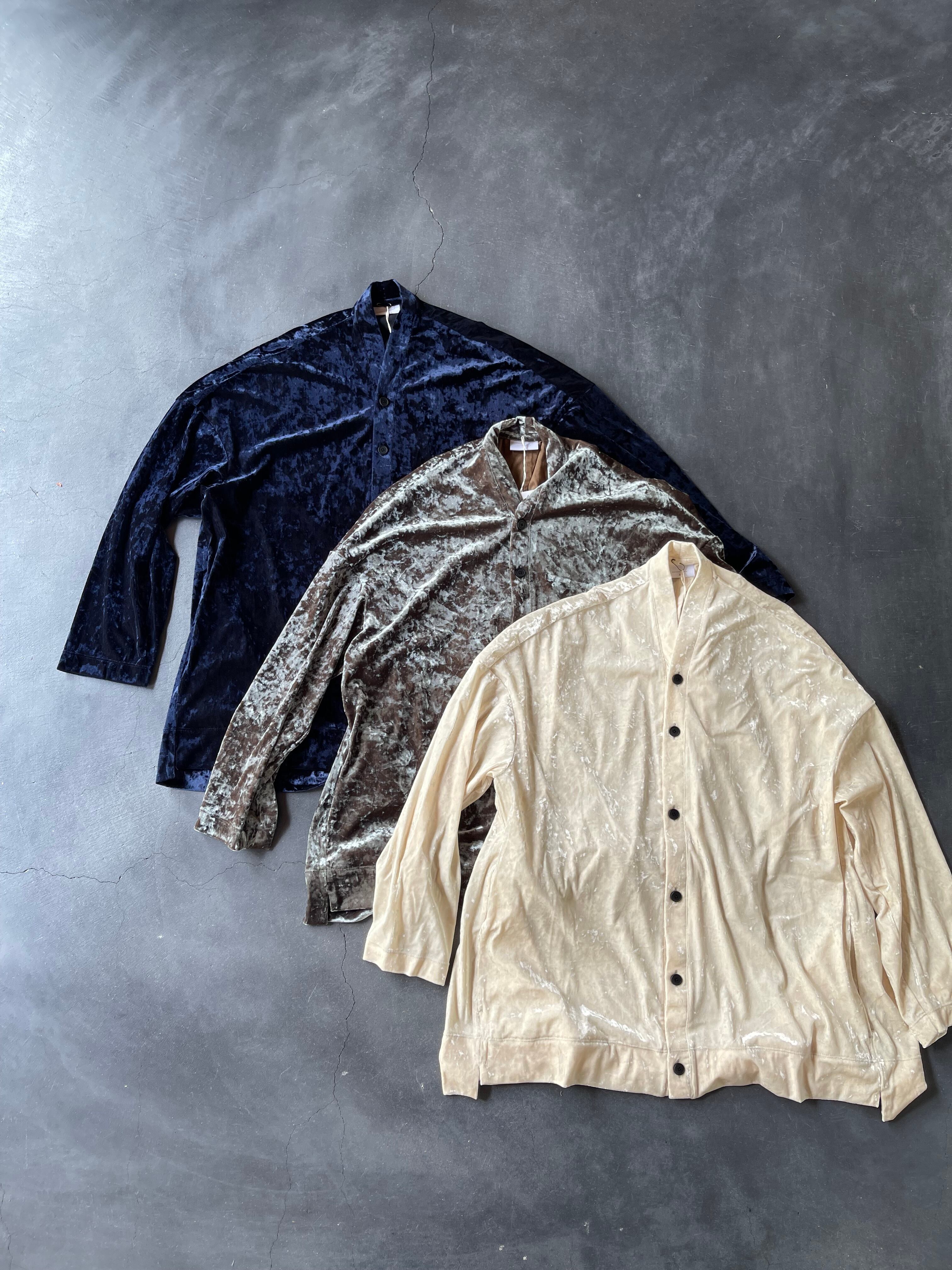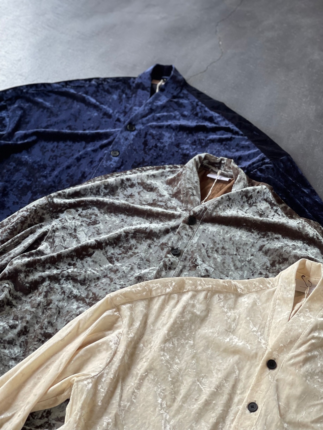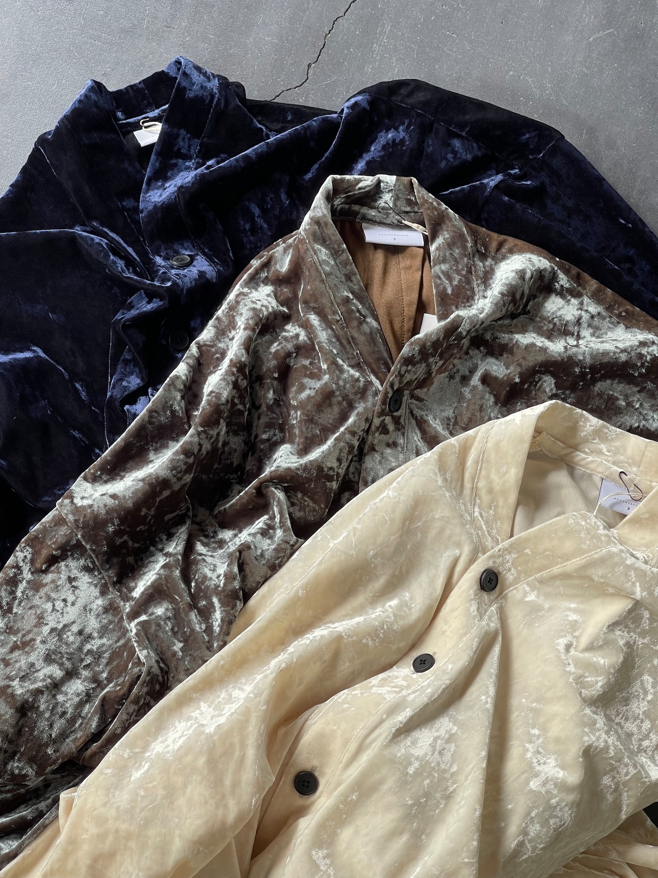 ブライトポリエステルとナイロン糸を使用したトリコットパイル生地をシャンブレーに染め分けクラッシュ加工を入れたニットベロア生地です。