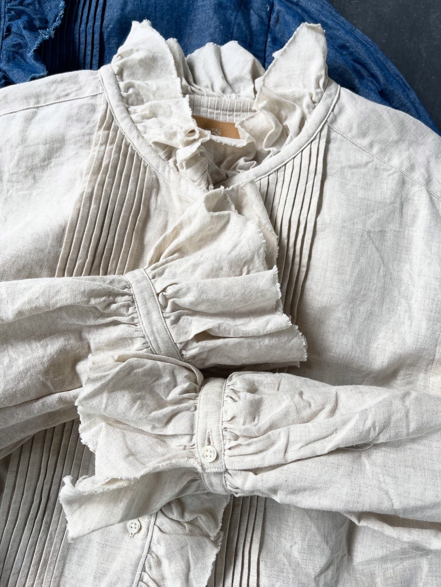 1960 年代のヴィンテージブラウスをベースに、ドライシャツダンガリーで仕立てた一着。
