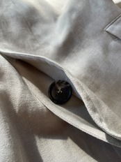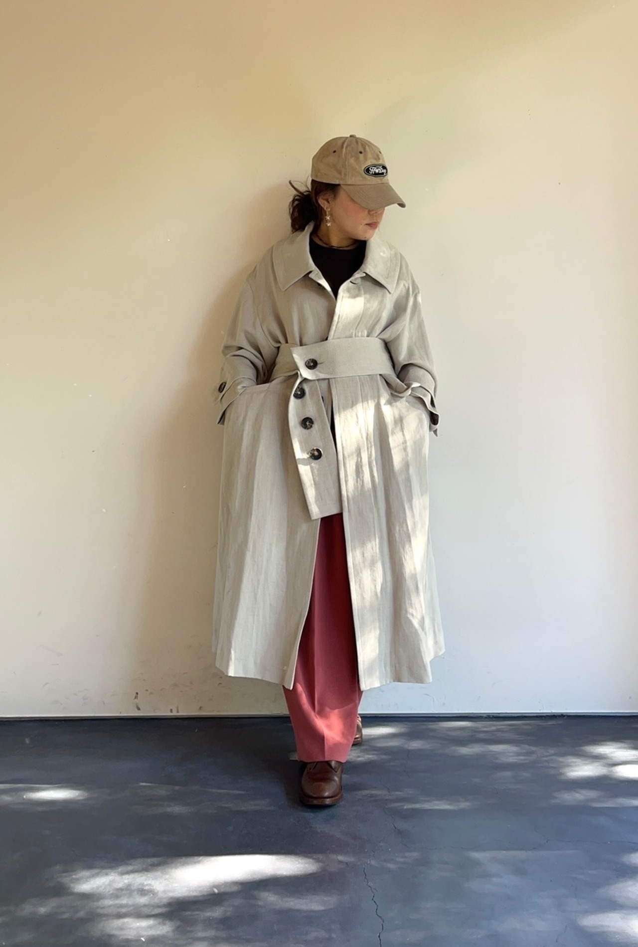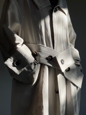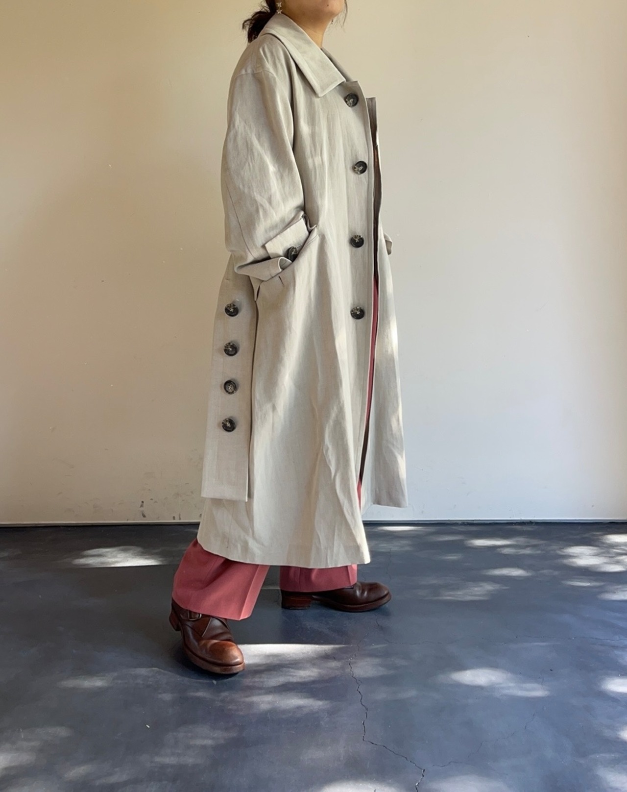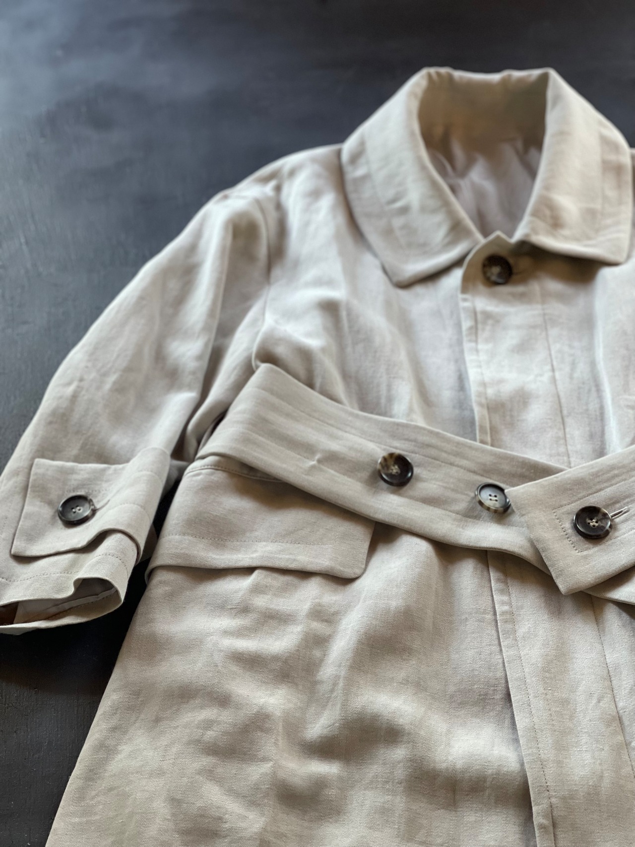 経糸にオーストラリア厳選の羊毛、緯糸にリネンを配してツイル組織に織り上げ、ウールのドレープ性とリネン特有のシワ感を備えたバルマカーンコートです。
