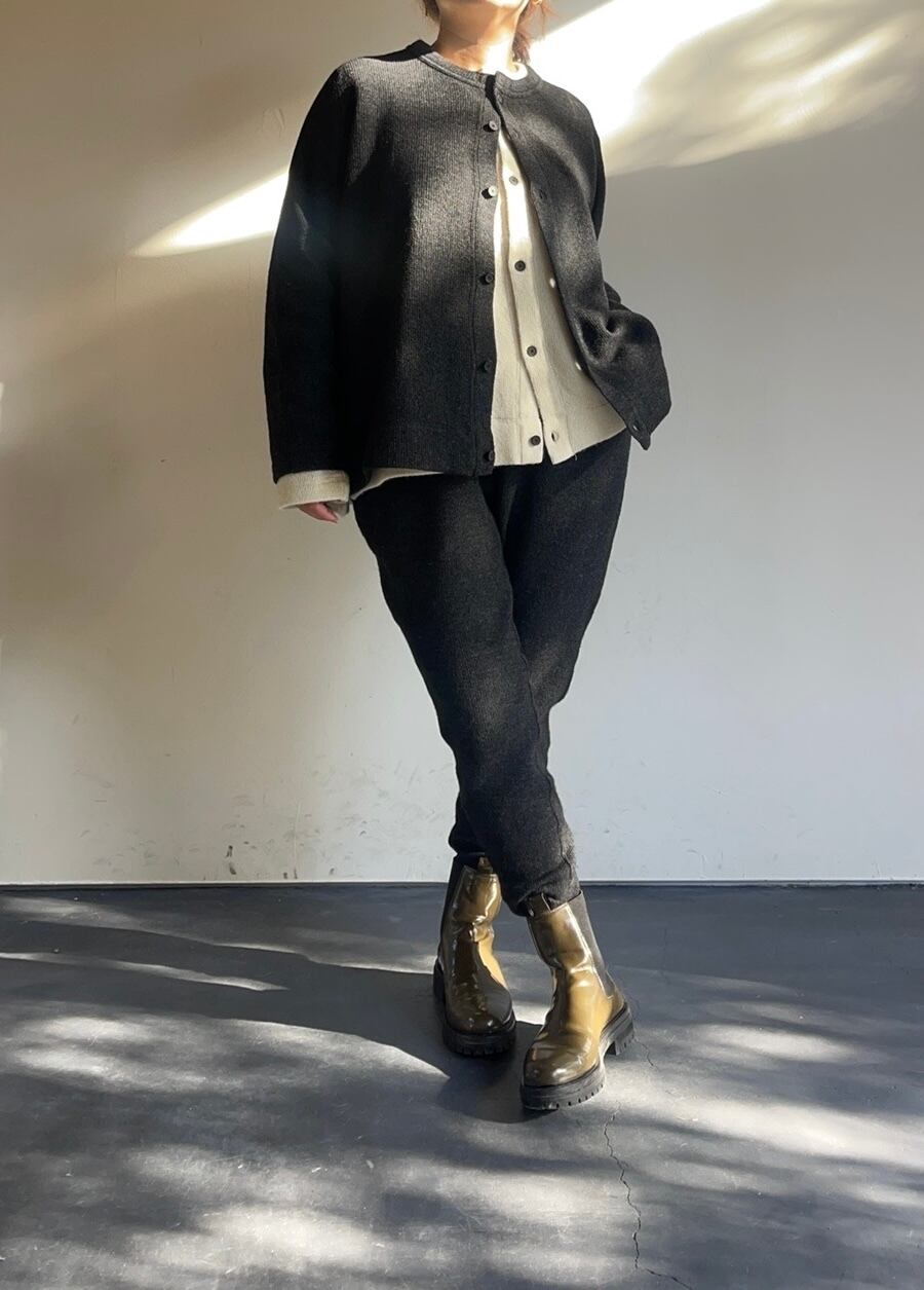 表と裏で異ゲージで編めるクォーターフェイスという編み機で二重編みで編んだニットです。