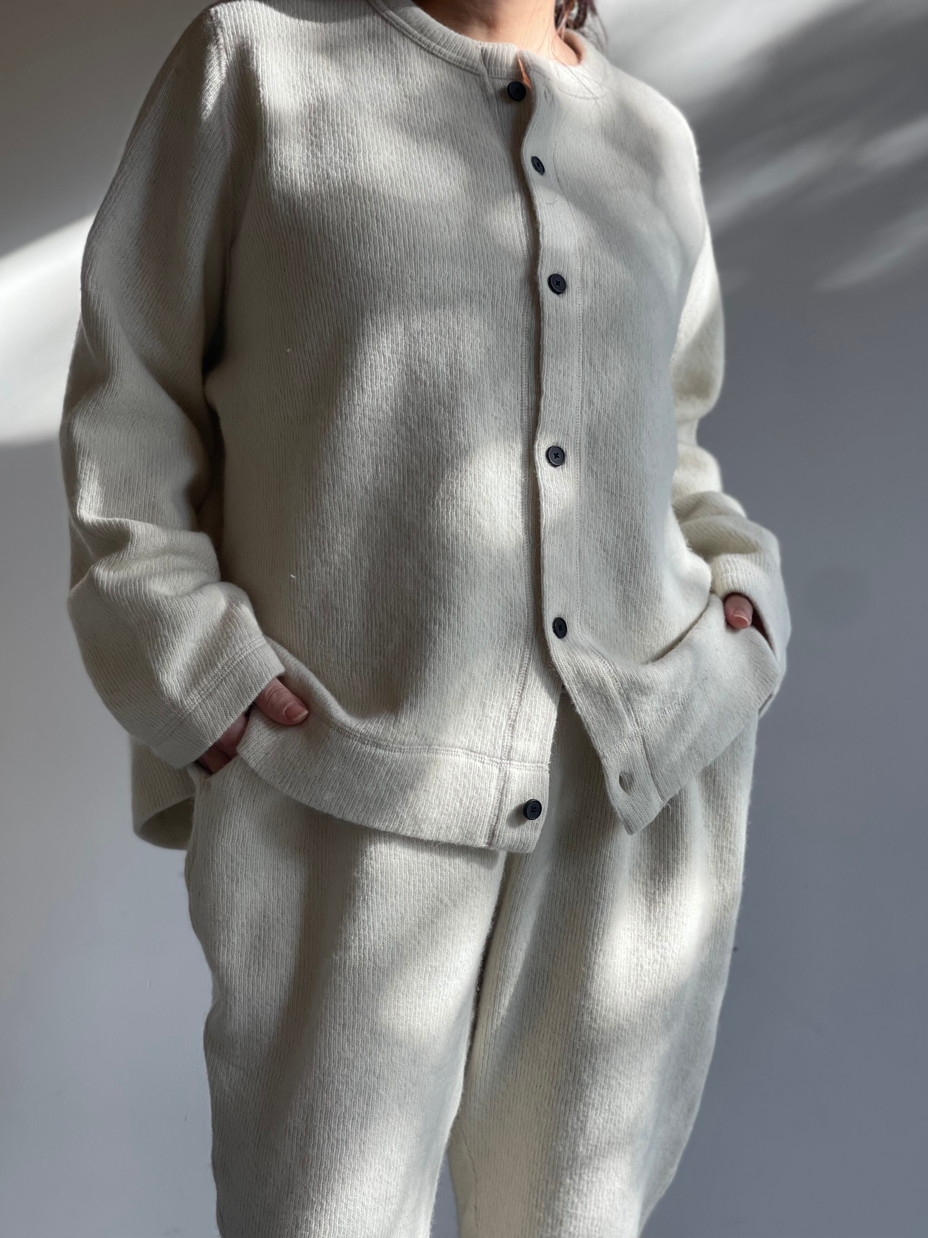 肌面は綿があたるのでタッチも良く、表面のウールの膨らみも相まってとても軽く暖かい着心地が良い生地です。